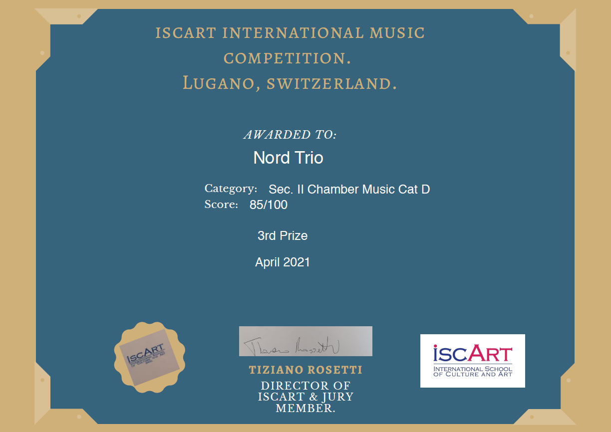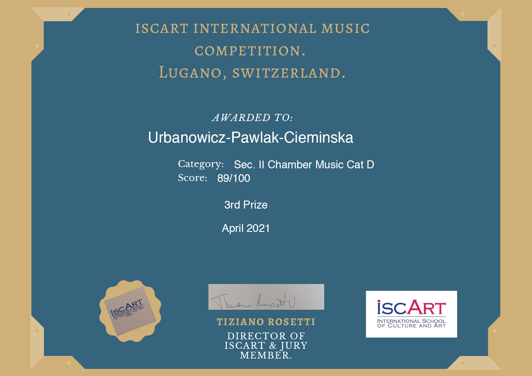 Zespoły kameralne aMuz zostały laureatami nagród w sekcji II – muzyka kameralna na 2. ISCART International Online Music Competition w Lugano/Szwajcaria (26.04.2021):