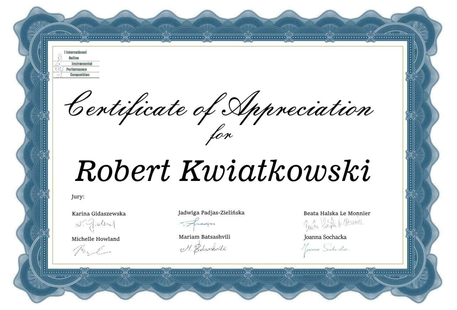 Dr hab. Robert Kwiatkowski, skrzypek, kameralista, pedagog Wydziału Instrumentalnego aMuz, został laureatem Pomorskiej Nagrody Artystycznej za 2020 rok w kategorii Kreacje Artystyczne za przygotowanie i poprowadzenie w podwójnej roli – skrzypka solisty i dyrygenta – koncertu „Znane i nieznane dzieła klasyków wiedeńskich w Gdańsku” w PFB, a także za opublikowanie autorskich kadencji do wszystkich dziewięciu klasycznych koncertów skrzypcowych Mozarta, Haydna i van Beethovena.