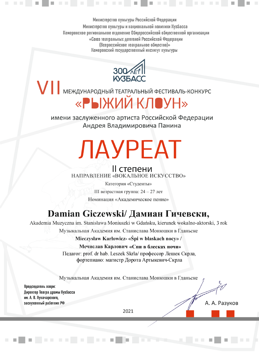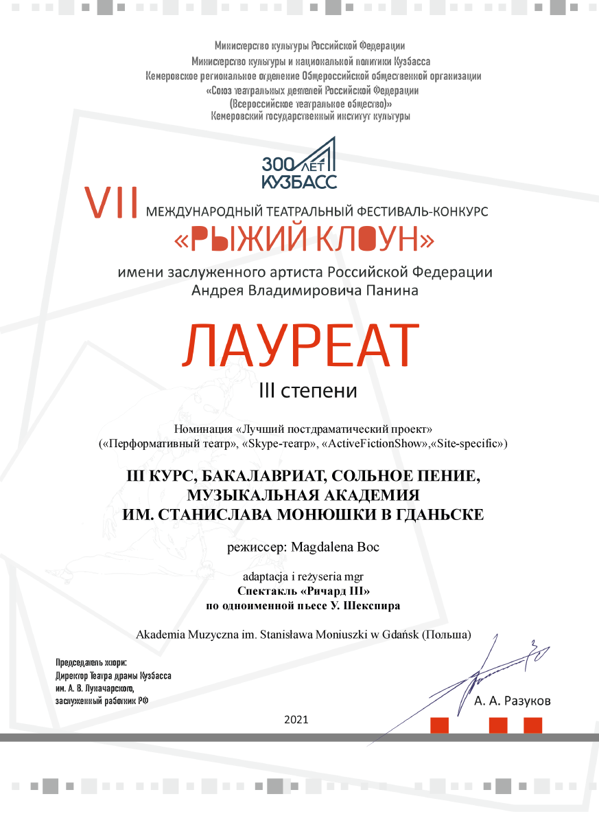 Na VII Międzynarodowym Teatralnym Festiwalu-Konkursie „Rudy Klaun” 2021 im. zasłużonego artysty Federacji Rosyjskiej Andrieja W. Panina (online) w Kemerowie/Rosja (22.02-22.03.2021):