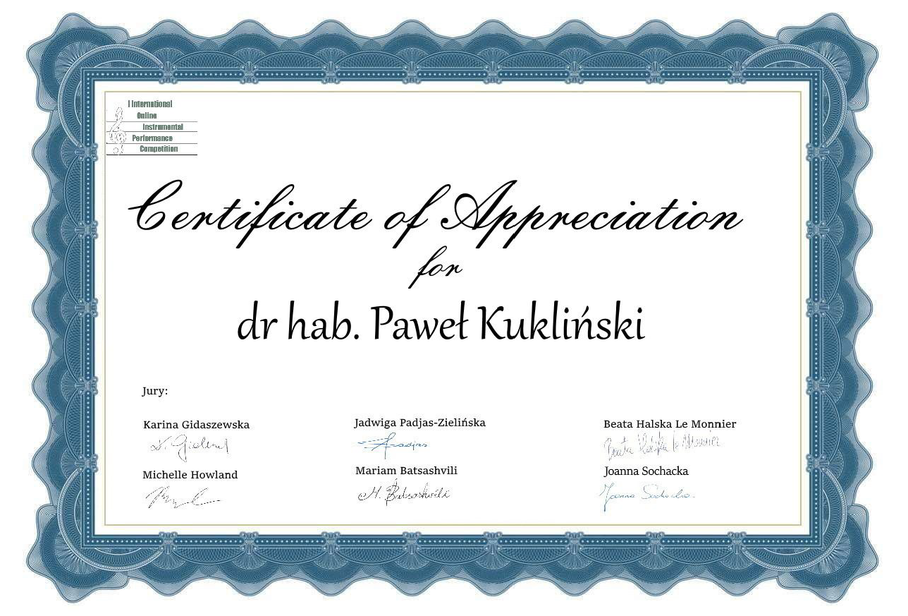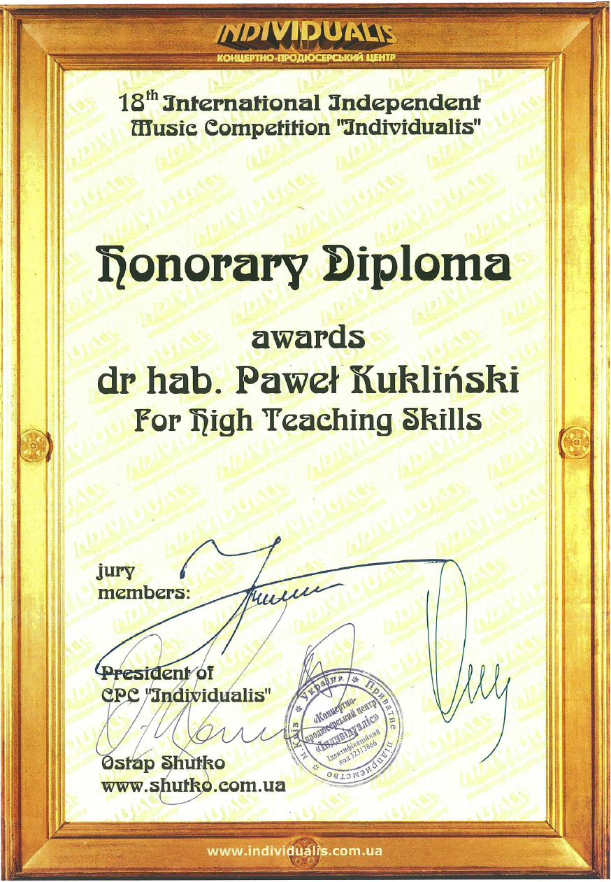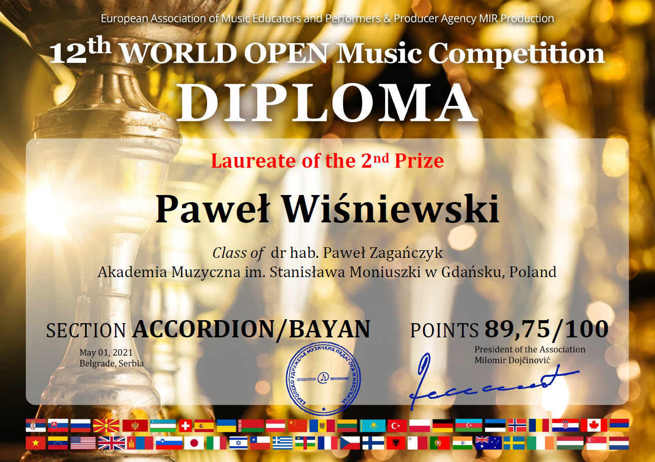 - Paweł Wiśniewski (III rok studiów I st.) z klasy akordeonu dra hab. Pawła Zagańczyka zdobył WYRÓŻNIENIE w kat. V Senior oraz WYRÓŻNIENIE w kat. VI Virtuoso Entertainment Music.