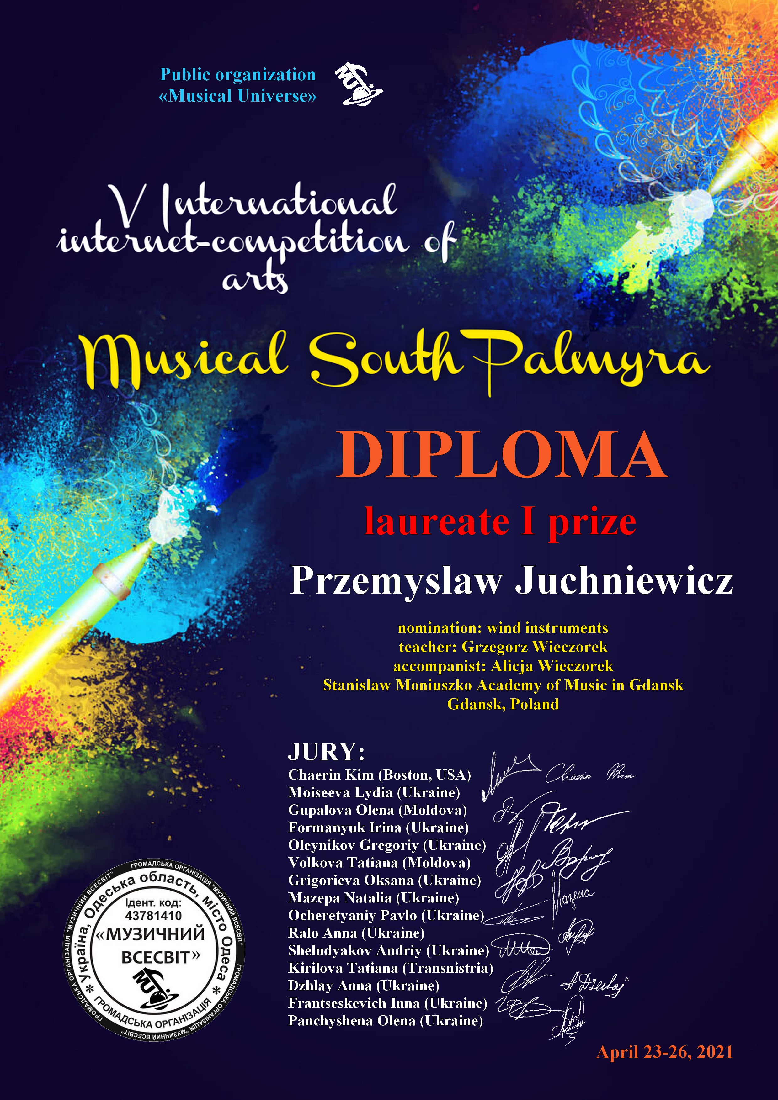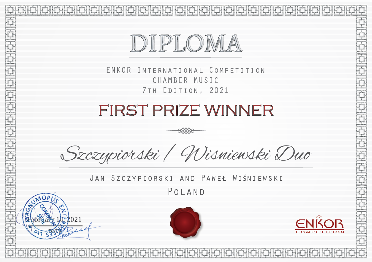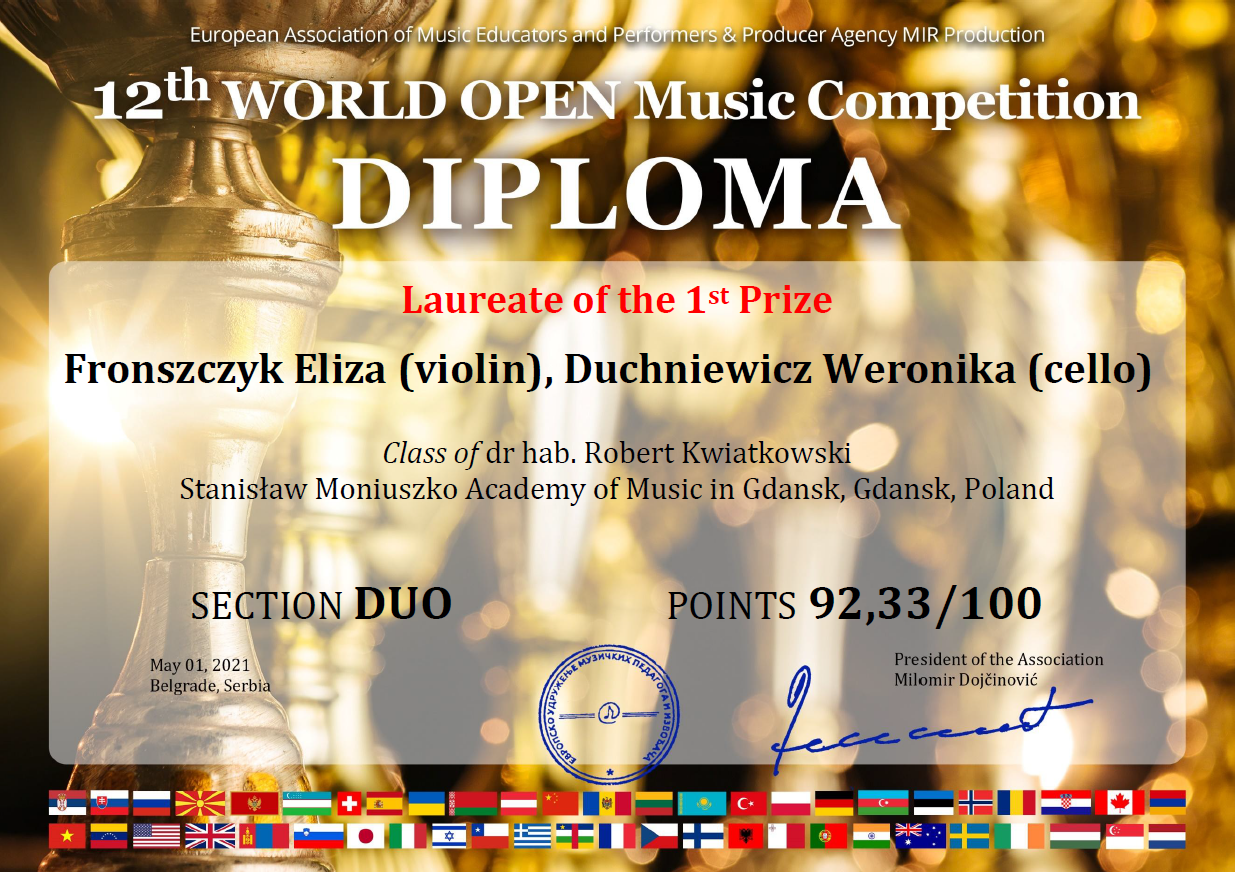 Szczypiorski & Wiśniewski Duo w składzie: Jan Szczypiorski – skrzypce i Paweł Wiśniewski – akordeon (III rok studiów I st.) z klasy kameralistyki dra hab. Pawła Zagańczyka i dr Pauli Preuss zdobył I NAGRODĘ w kat. SMALL ENSEMBLES na International Competition of the Accordion Players „Concord of Sounds 2021” na Łotwie (16-20.05.2021), organizowany przez Mārupe Music and Art School we współpracy z klasą akordeonu Jāzeps Vītols Latvian Academy of Music oraz International Music Schools Association „CON ANIMA”.