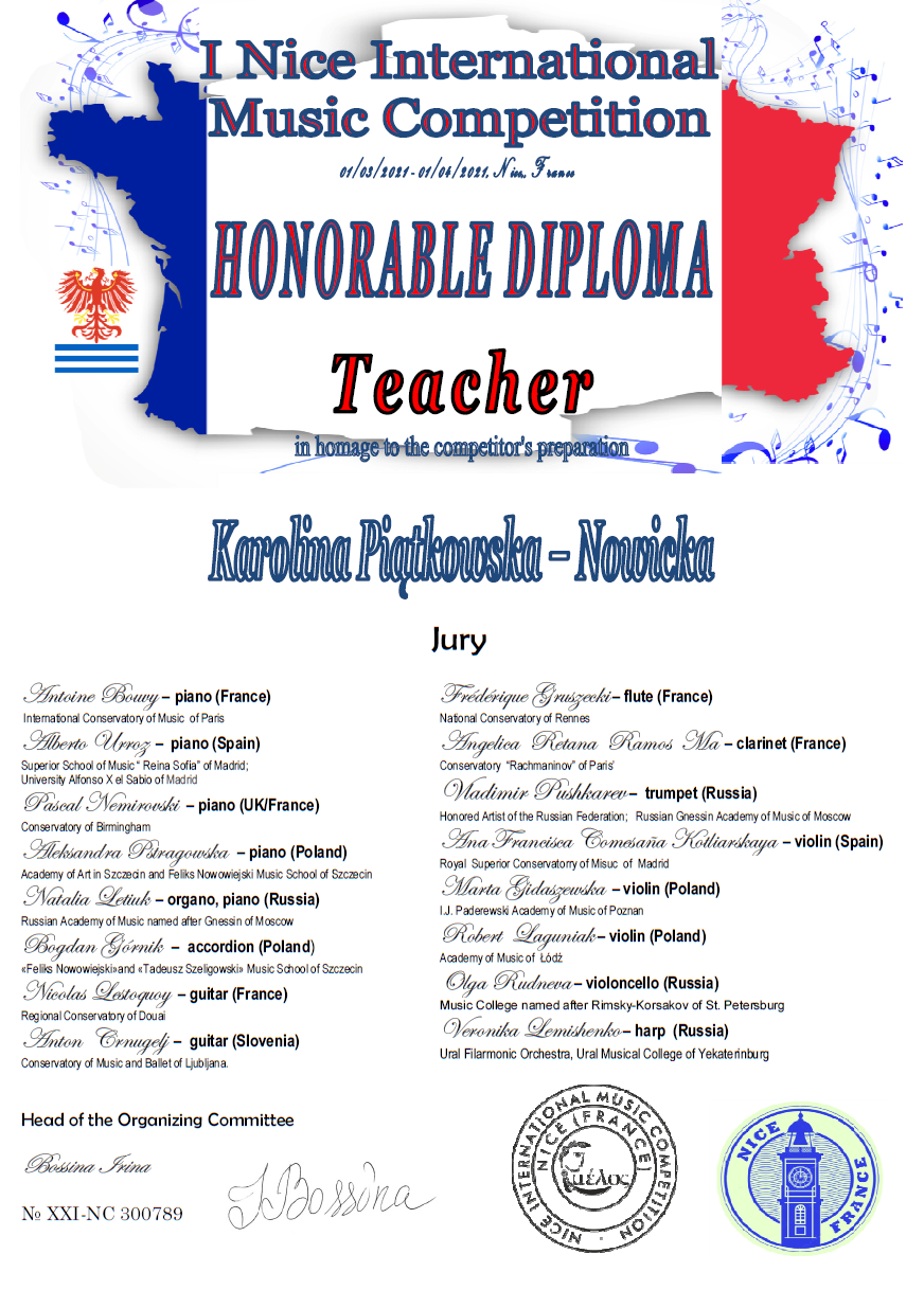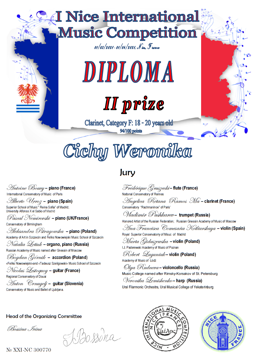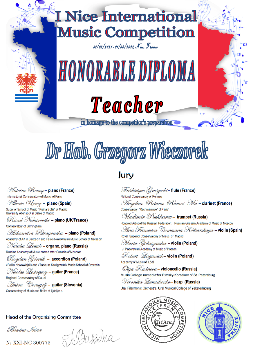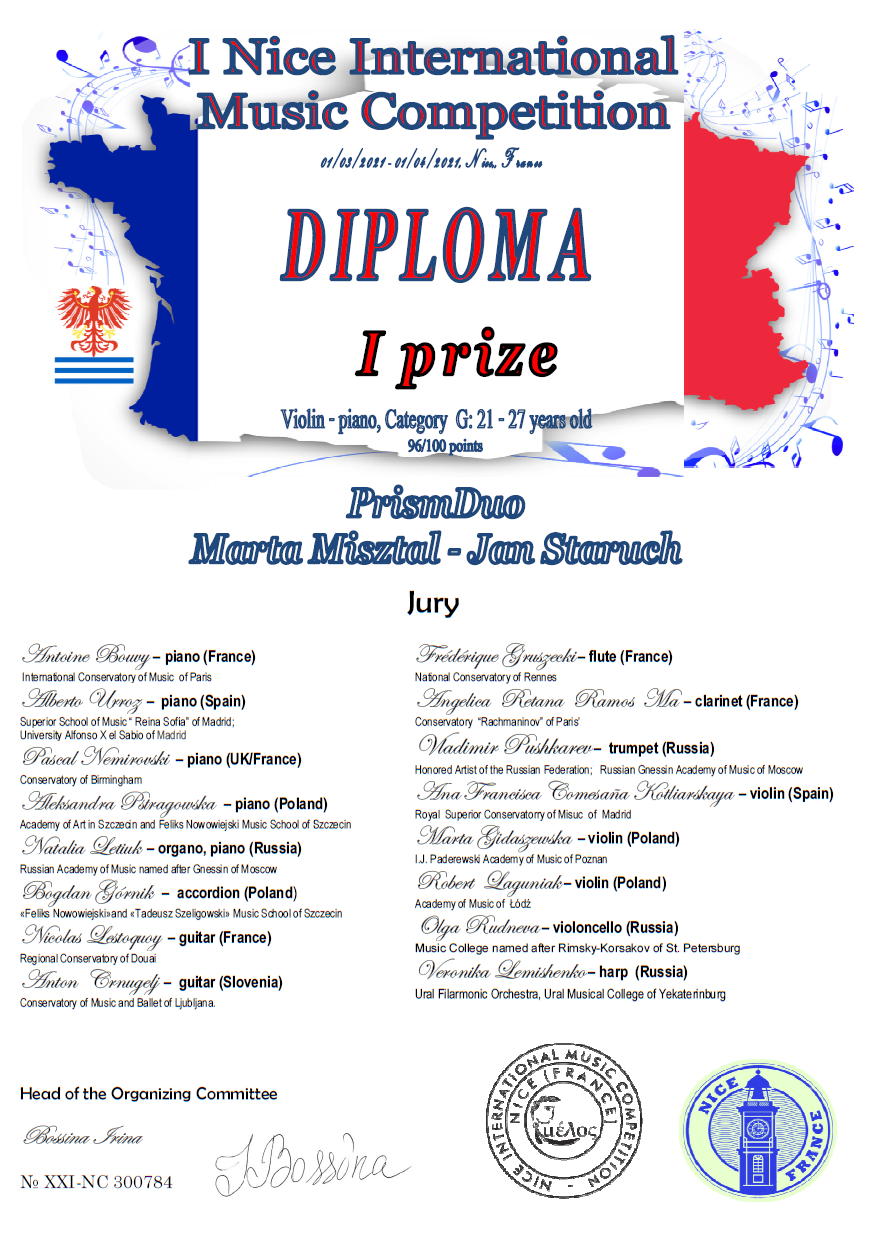 Na I Nice International Music Competition w Nicei/Francja (1.03-1.04.2021) studenci aMuz zdobyli nagrody: