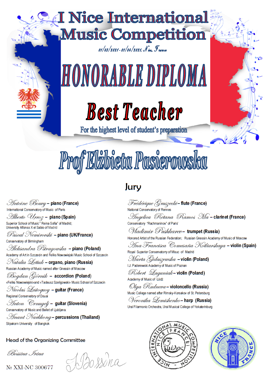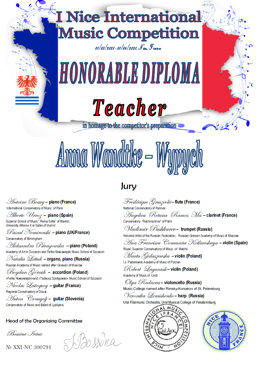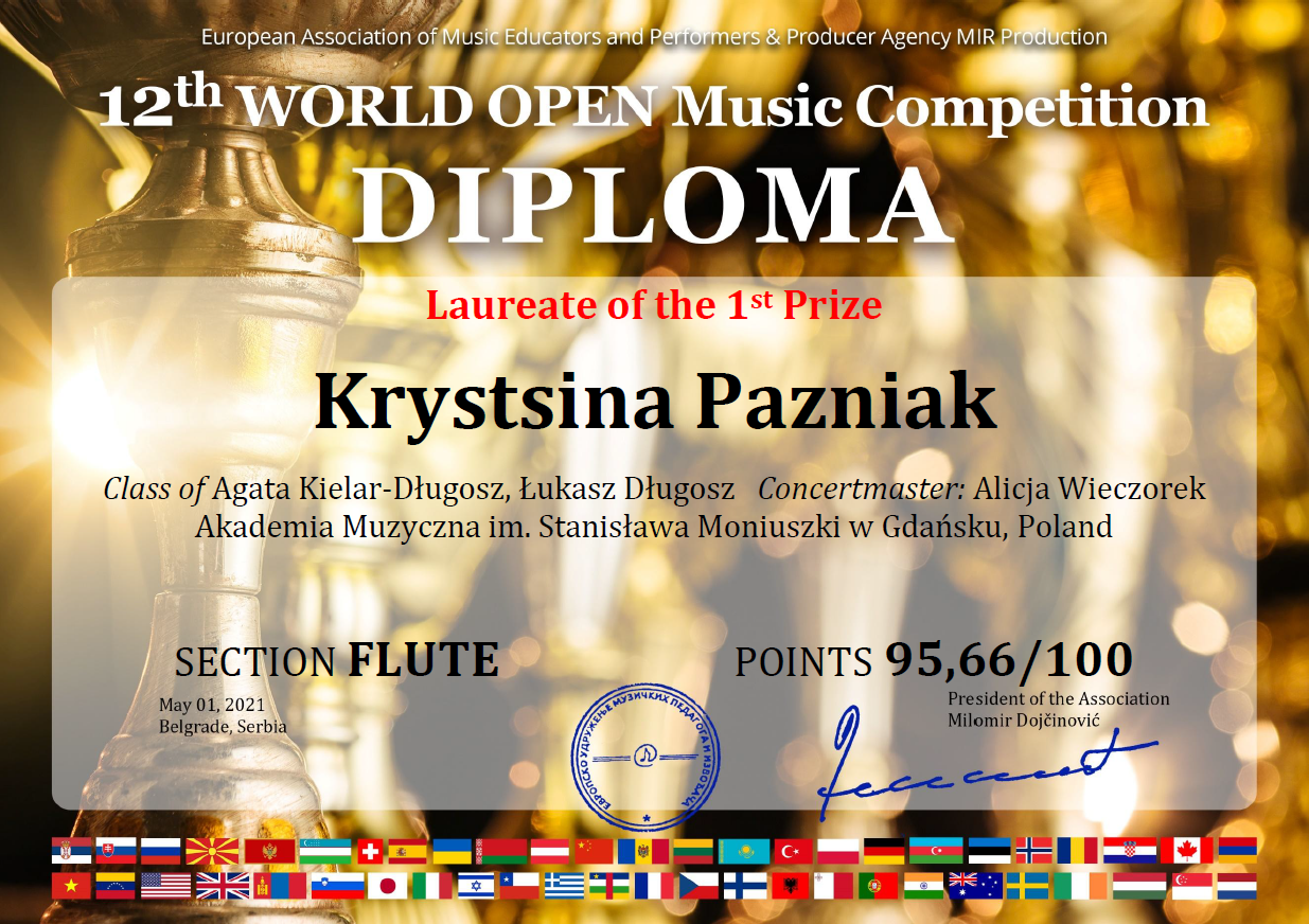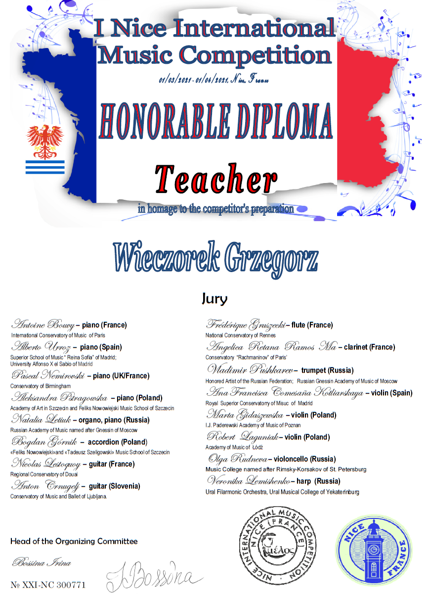 Na I Nice International Music Competition w Nicei/Francja (1.03-1.04.2021) studenci aMuz zdobyli nagrody: