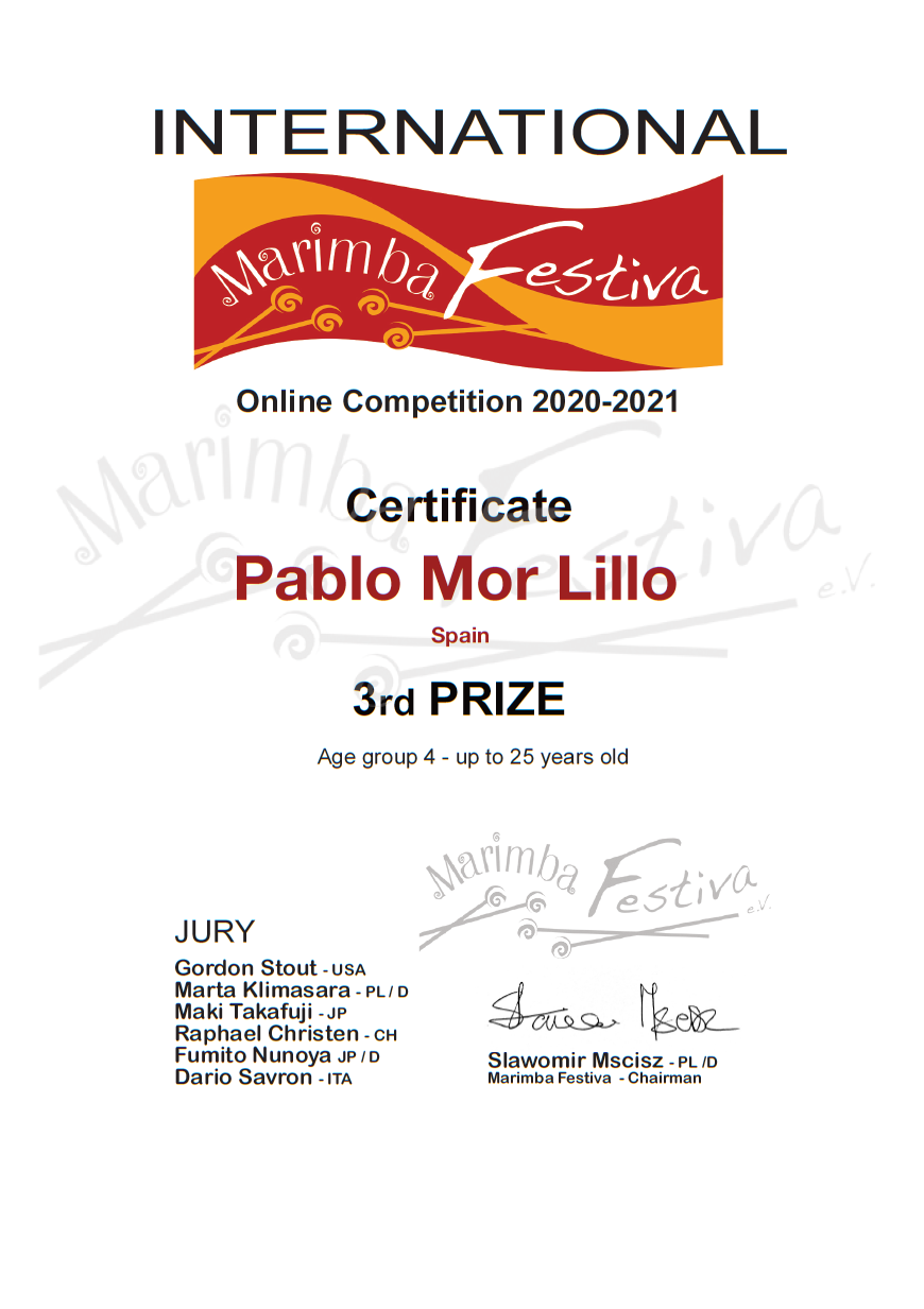 - Pablo Mor Lillo (II rok studiów II st.) z klasy perkusji dr hab. Katarzyny Myćki zdobył III NAGRODĘ w sekcji IV, kat. D;
