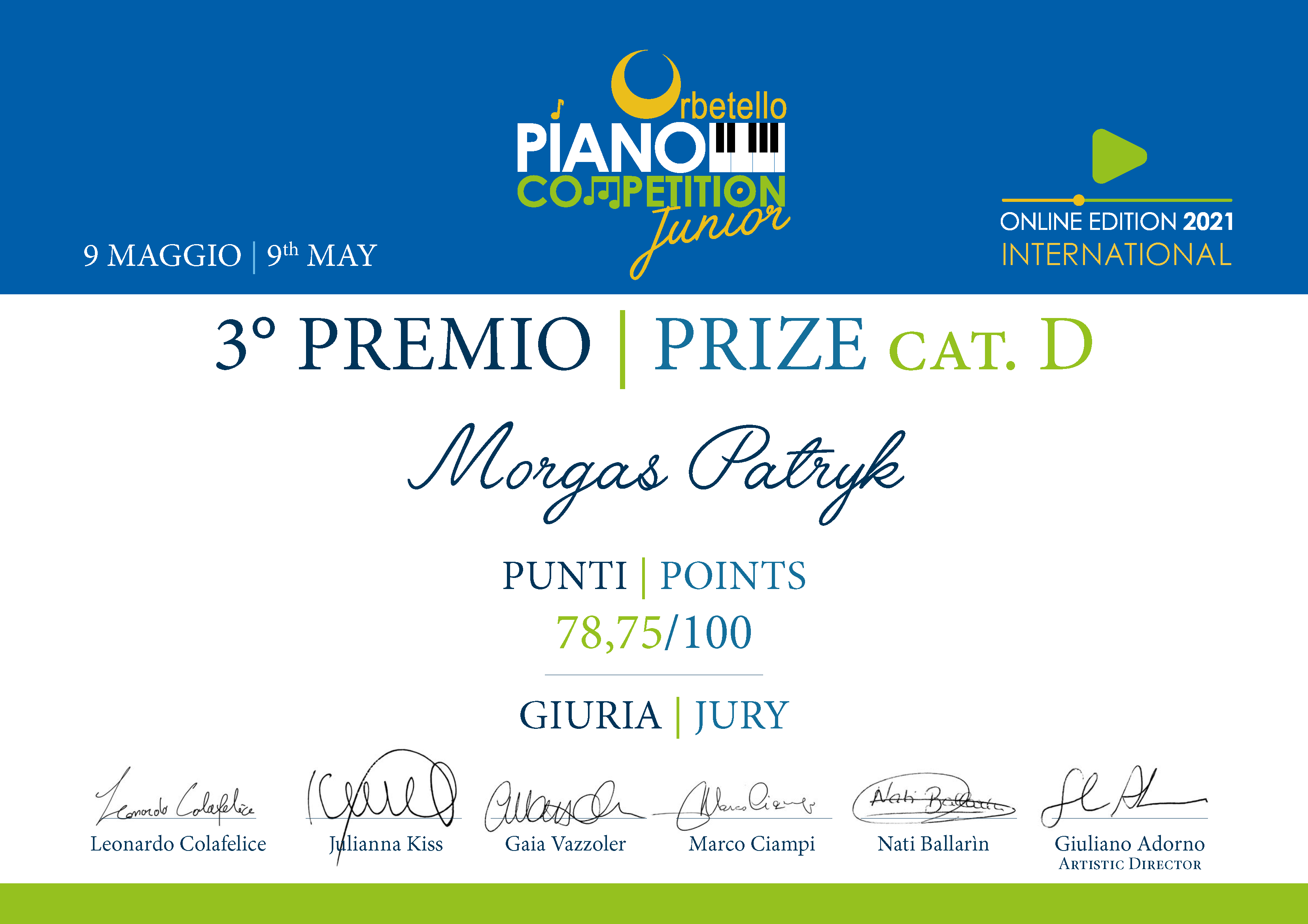 Mikołaj Sikała (III rok studiów III st.) z klasy fortepianu dr hab. Elżbiety Pasierowskiej został laureatem II NAGRODY ex aequo oraz nagrody specjalnej „Young Artist Special Concert Prize” na 24. Międzynarodowym Konkursie Pianistycznym „Mauro Paolo Monopoli Prize” / 24. Concorso Internazionale di Esecuzione pianistica “Premio Mauro Paolo Monopoli” w Barletcie/Włochy (30.09-3.10.2021).