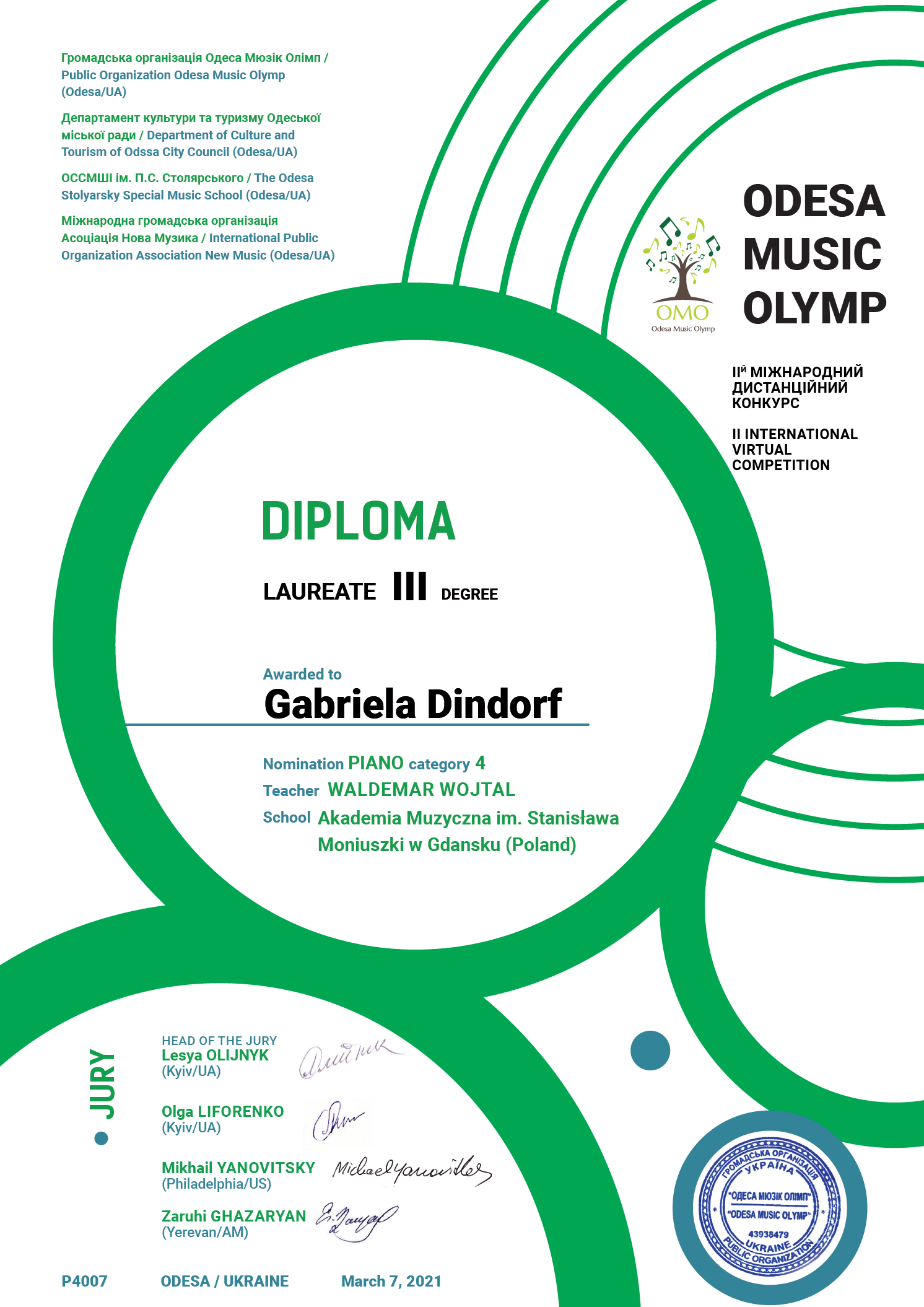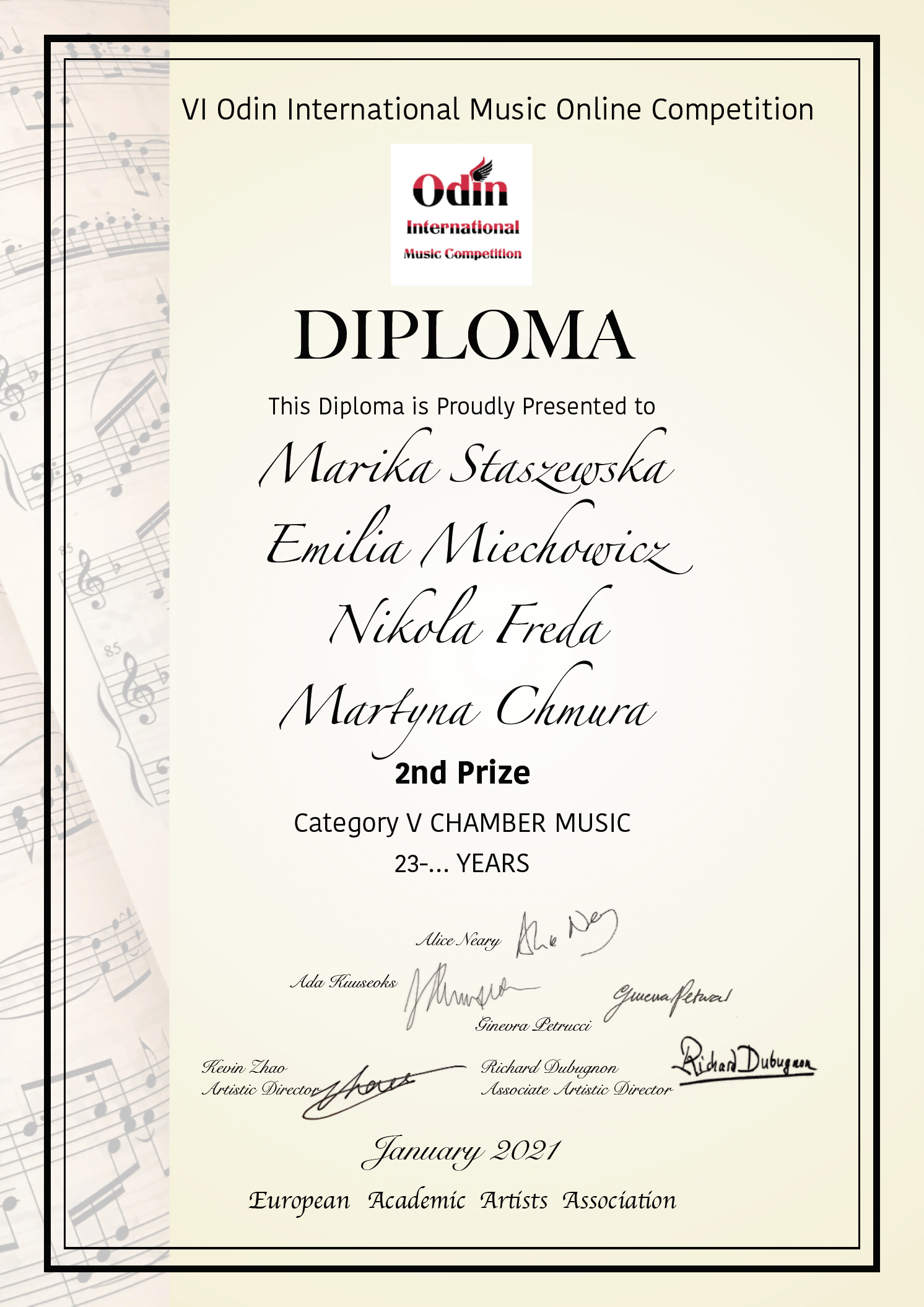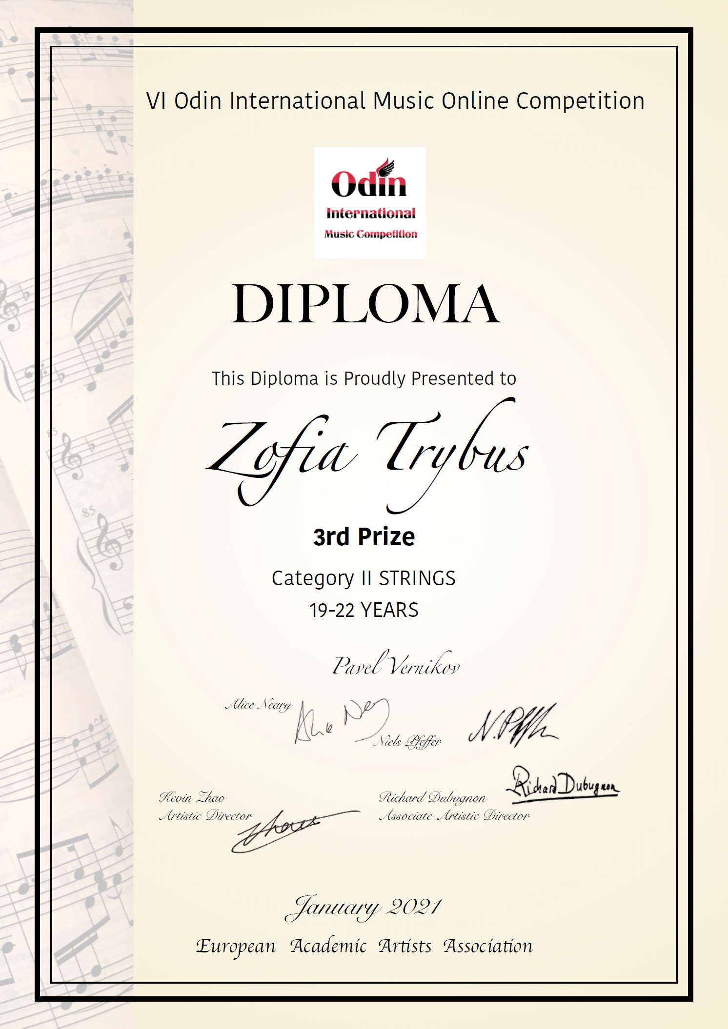Studenci aMuz zostali LAUREATAMI VI Odin International Music Online Competition 2021 (10-29.01.2021), organizowanego online przez European Academic Artists Association (EAAA):
