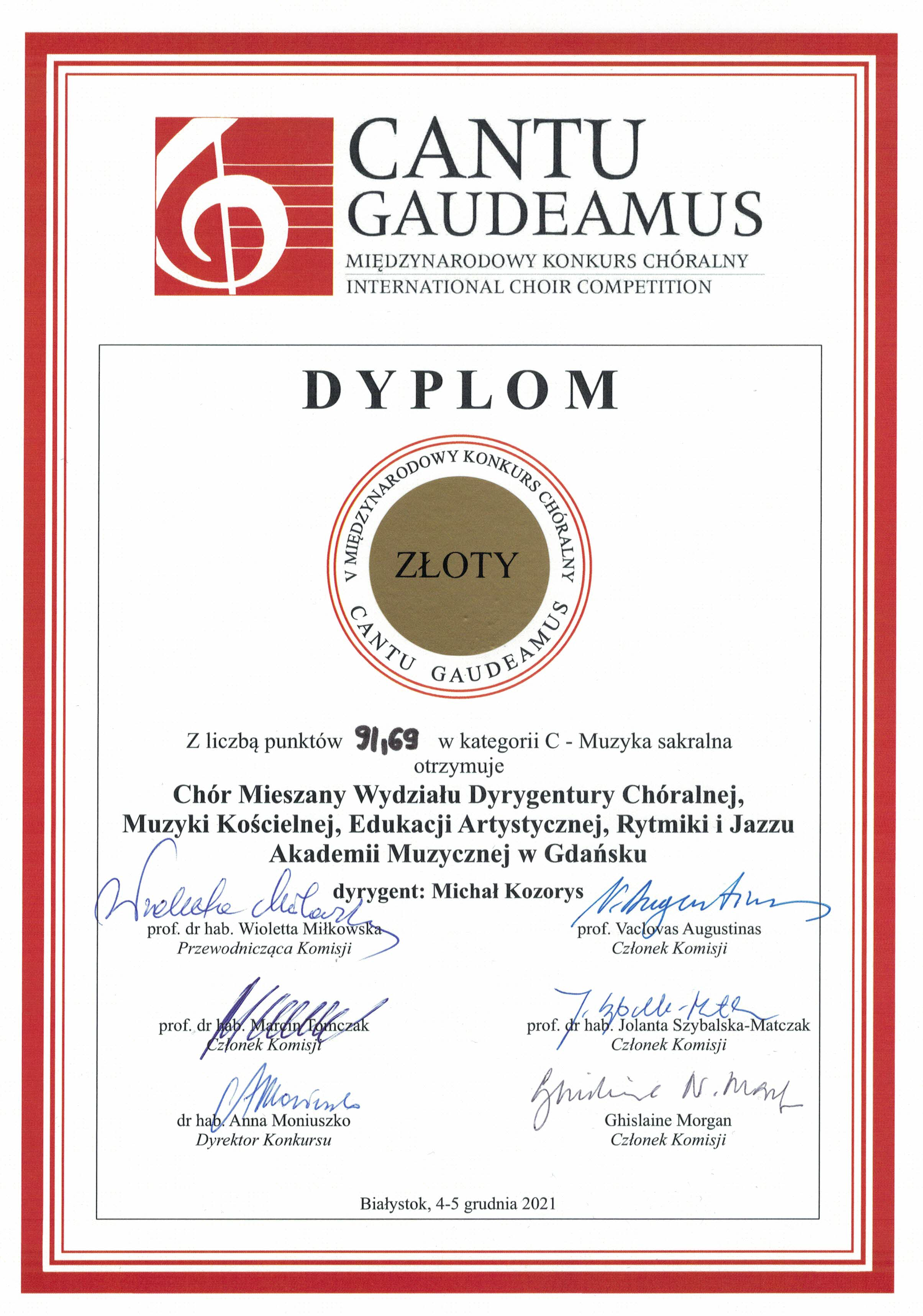 Chór Mieszany Wydziału Dyrygentury Chóralnej, Muzyki Kościelnej, Edukacji Artystycznej, Rytmiki i Jazzu pod dyrekcją dra hab. Michała Kozorysa zdobył ZŁOTY DYPLOM (91,69 pkt.) w kategorii C – Muzyka sakralna na V Międzynarodowym Konkursie Chóralnym „Cantu Gaudeamus” w Białymstoku (4-5.12.2021).