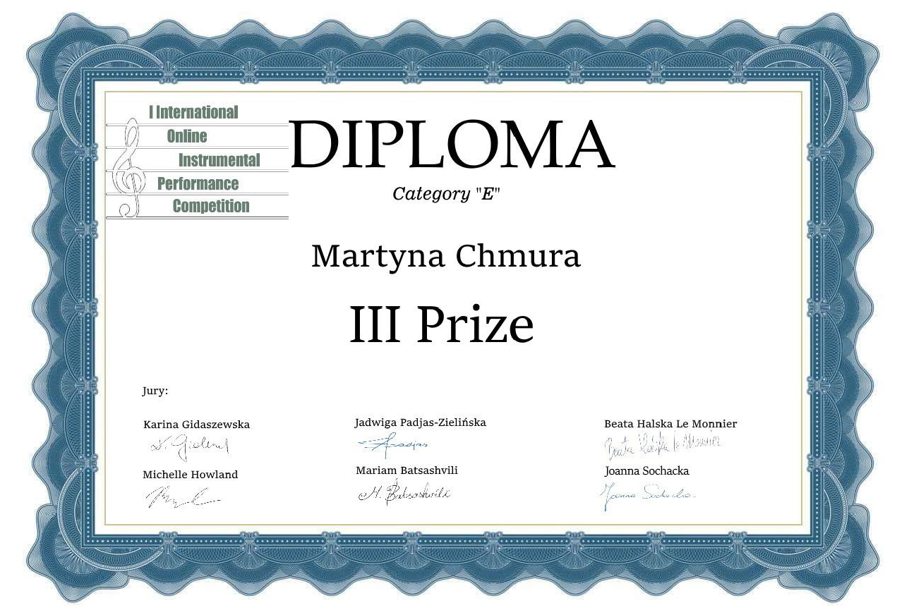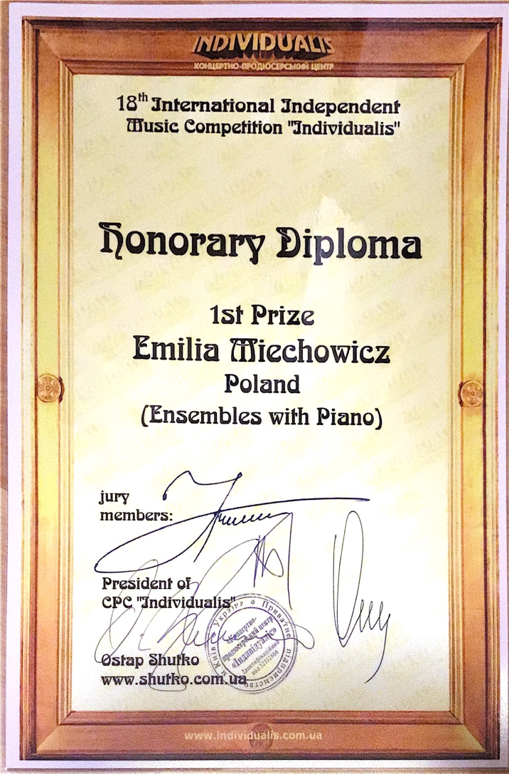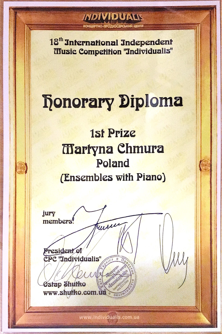 - Martyna Chmura (I rok studiów II st.) z klasy fortepianu dr hab. Elżbiety Pasierowskiej zdobyła III NAGRODĘ w sekcji I, kat. D;