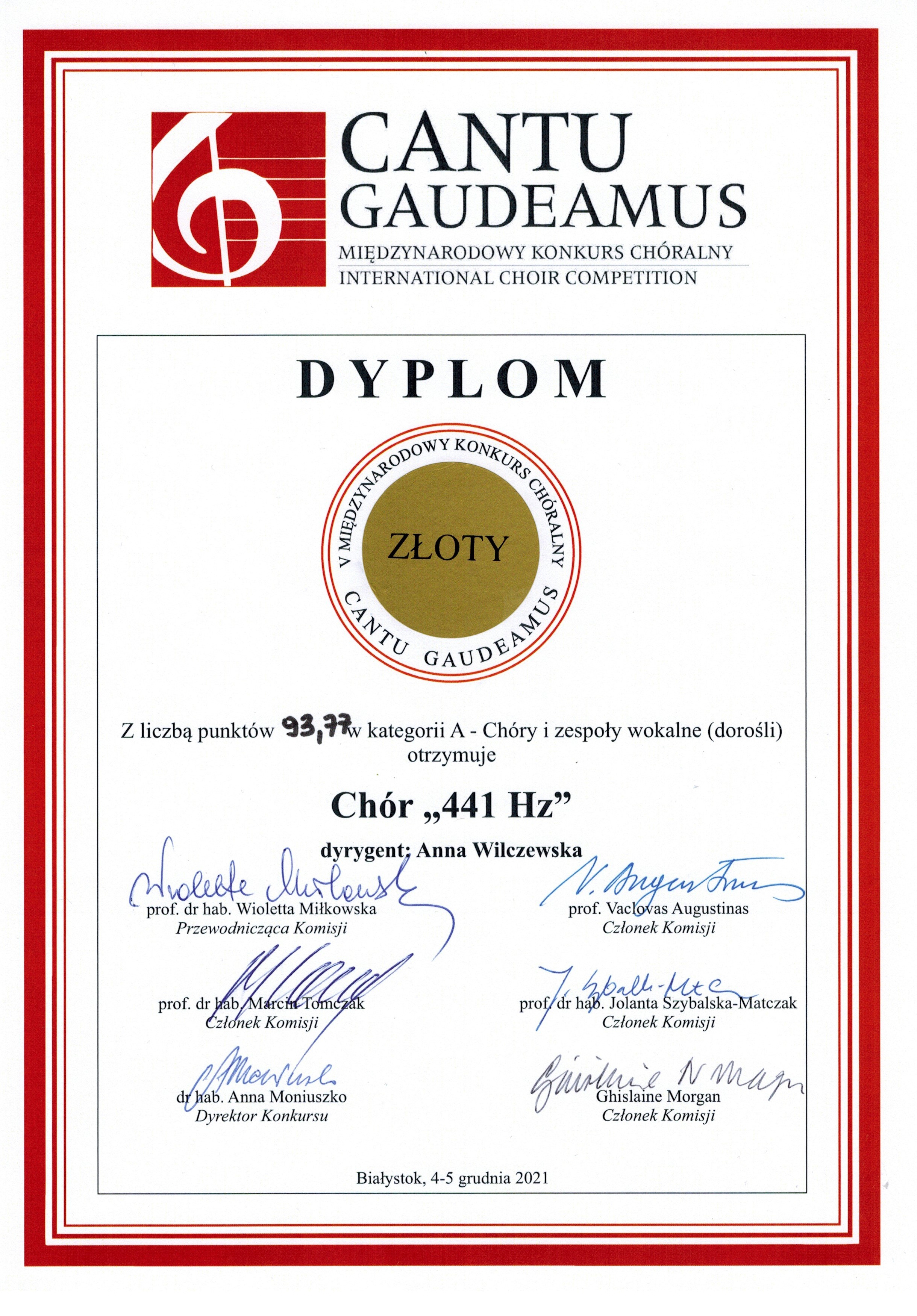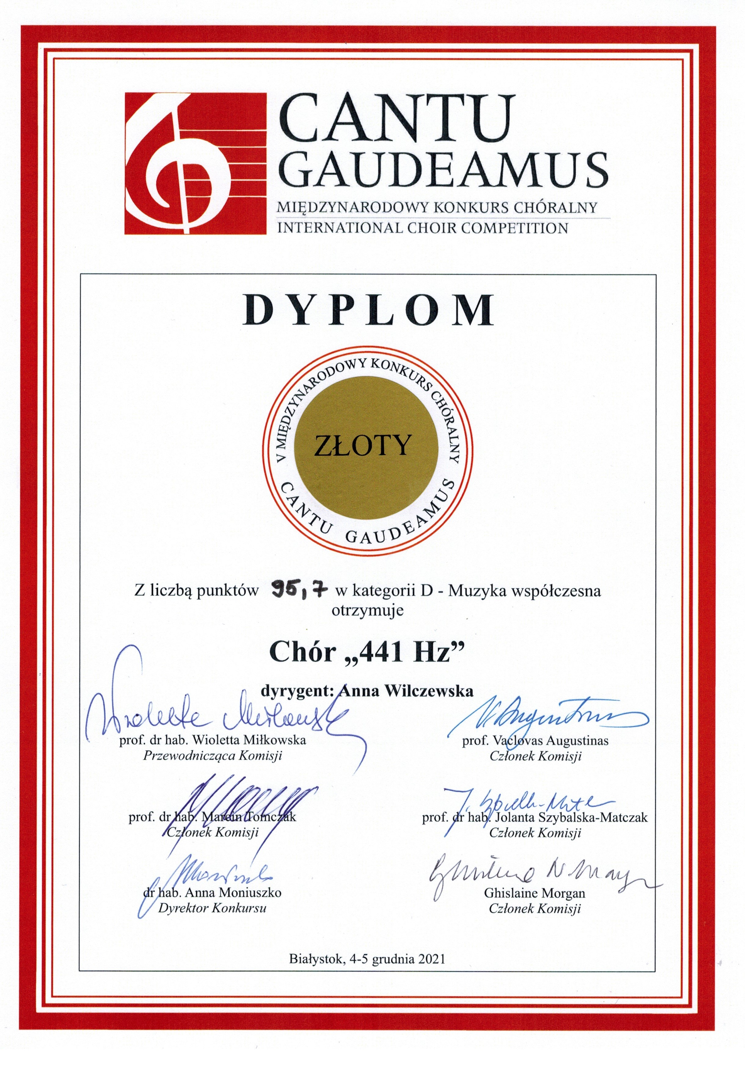 Na tym samym Konkursie Chór 441 Hz pod dyrekcją dr hab. Anny Wilczewskiej zdobył ZŁOTY DYPLOM i zwyciężył w kategoriach: A - Chóry i zespoły wokalne (dorośli) (93,76 pkt.) i D – Muzyka współczesna (95,7 pkt.), a także otrzymał DYPLOM UZNANIA Nieformalnego Jury Studentów Uniwersytetu Muzycznego Fryderyka Chopina Filii w Białymstoku za najlepszy występ w kategorii A - Chóry i zespoły wokalne (dorośli).