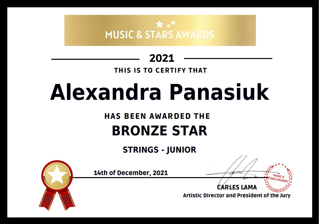 Alexandra Panasiuk (II rok studiów I st.) z klasy skrzypiec dr hab. Anny Wandtke-Wypych zdobyła BRONZE STAR w kat. Strings – Junior na Music&Stars Awards 2021 online. Przy fortepianie podczas nagrania towarzyszyła studentce dr Marta Kur. Wyniki Konkursu ogłoszono 14.12.2021.
