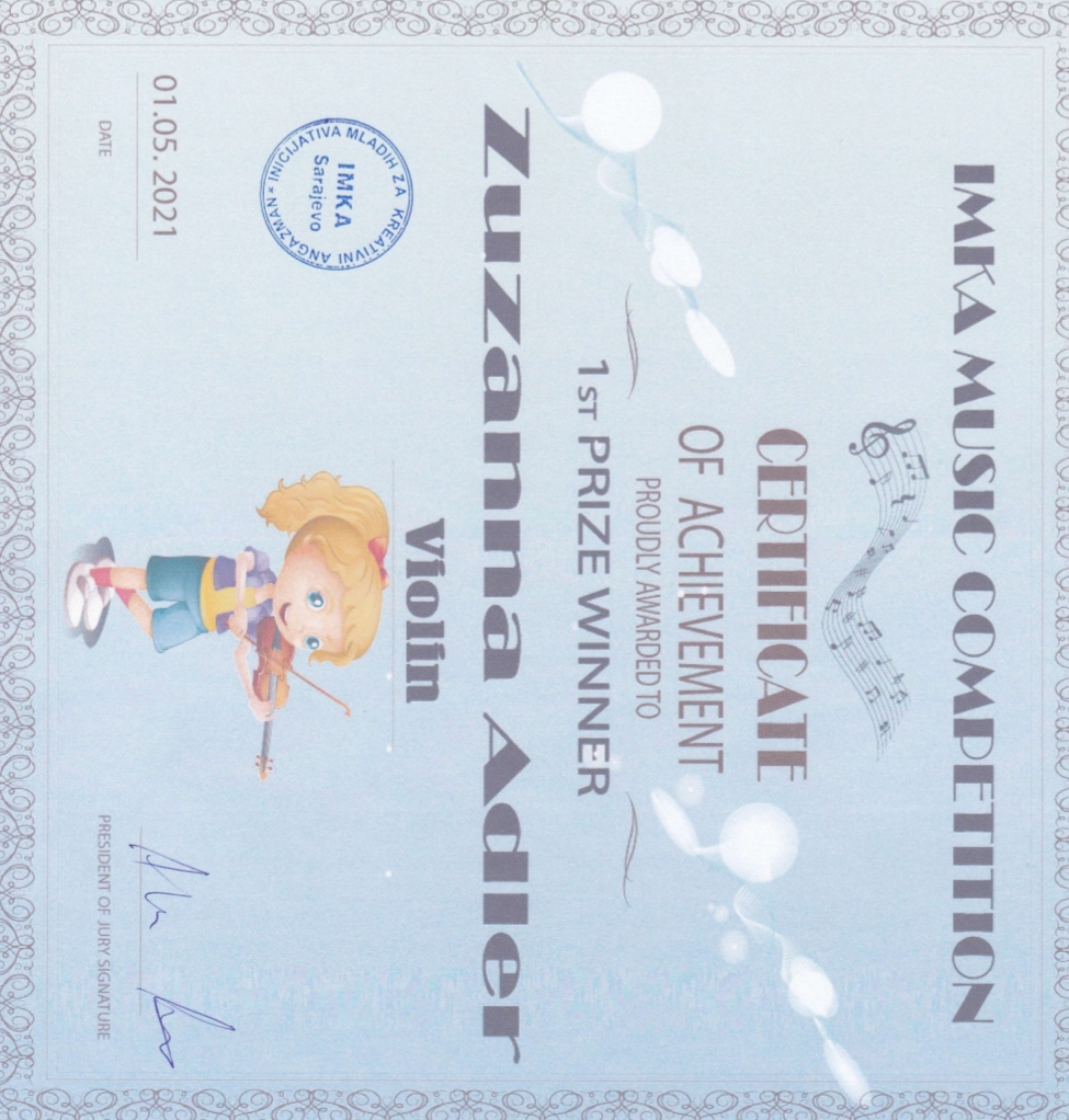 Alexandra Panasiuk (II rok studiów I st.) z klasy skrzypiec dr hab. Anny Wandtke-Wypych zdobyła I NAGRODĘ w kat. Strings S2 Cat. D na 1st Tiziano Rossetti International Music Competition w Lugano/Szwajcaria (grudzień 2021). Przy fortepianie podczas nagrania towarzyszyła studentce dr Marta Kur.