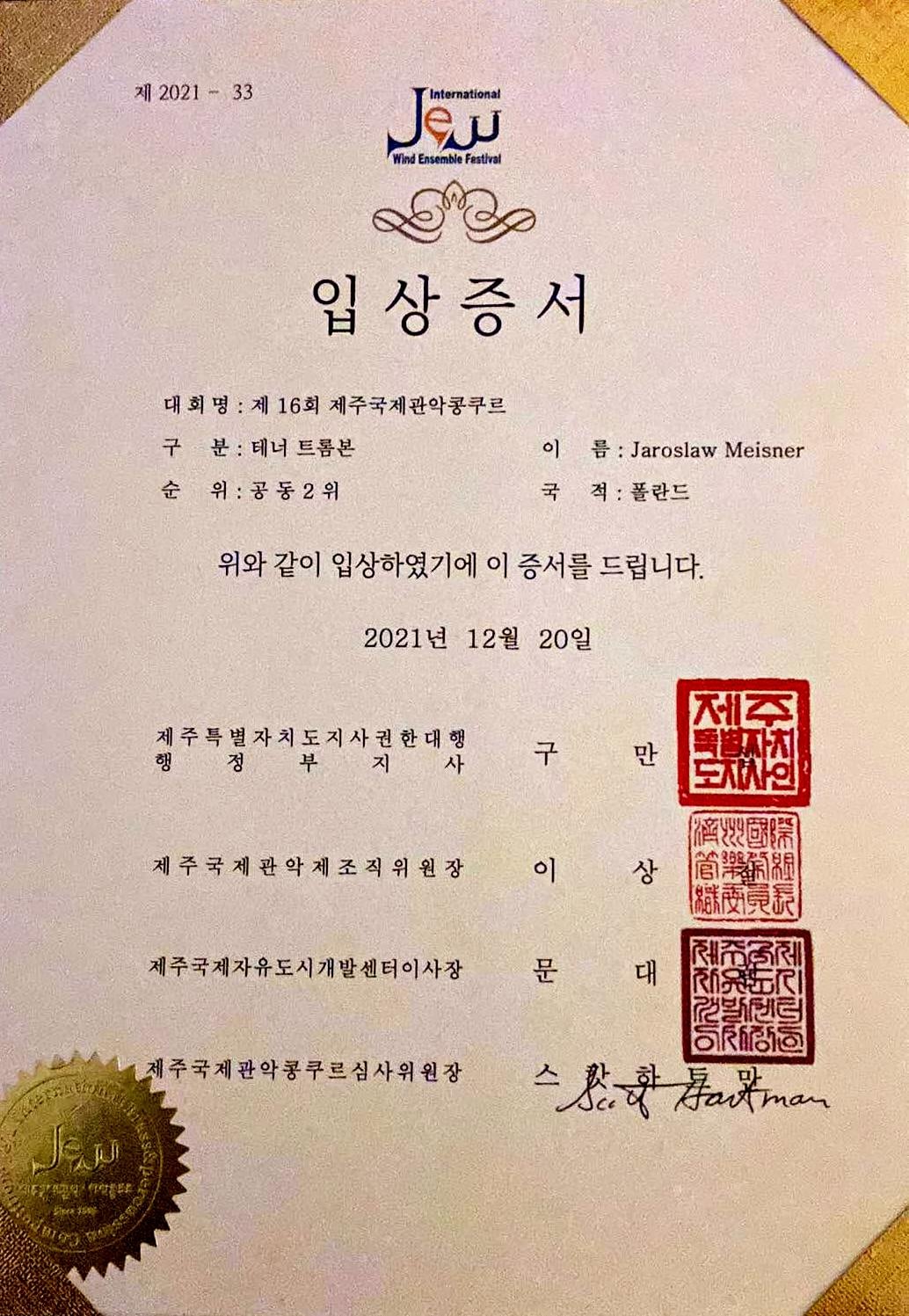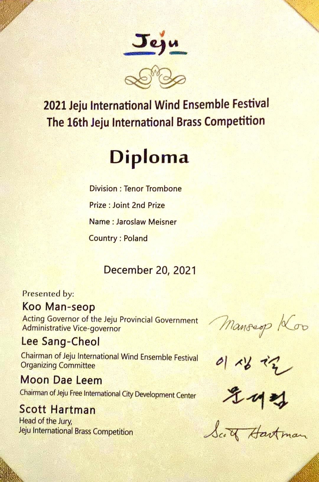 Mgr Jarosław Meisner, pedagog klasy puzonu, otrzymał II NAGRODĘ ex aequo w kat. puzon tenorowy na 16th Jeju International Brass Competition / 16. Międzynarodowym Konkursie Instrumentów Dętych Blaszanych w ramach 2021 Jeju International Wind Ensemble Festival w Jeju/Korea Południowa. Jury Konkursu przesłuchało ponad 100 uczestników z kilkudziesięciu krajów na całym świecie. Finał Konkursu odbył się 5.12.2021 r.