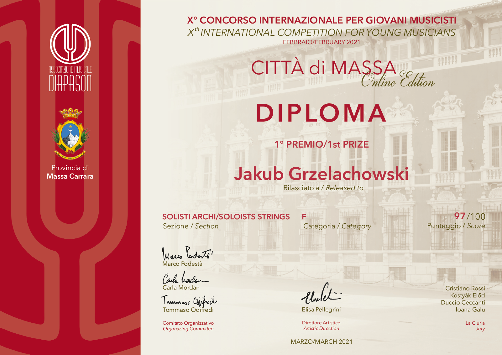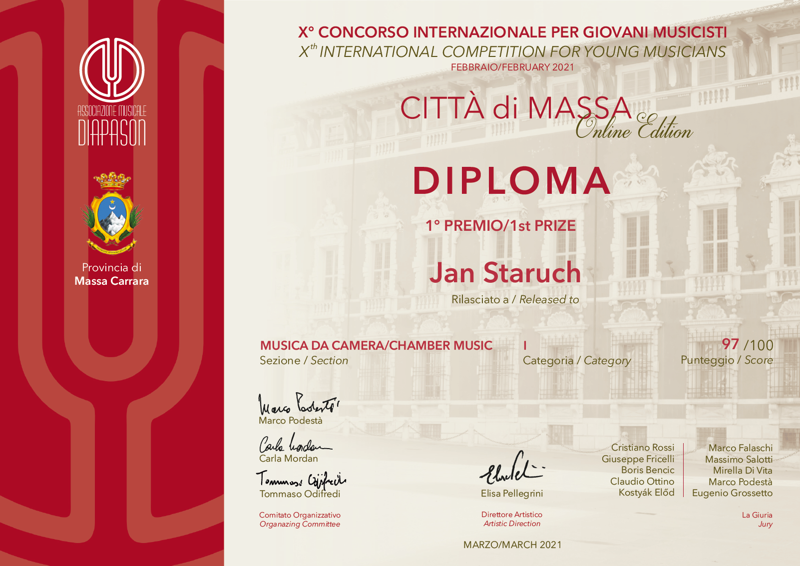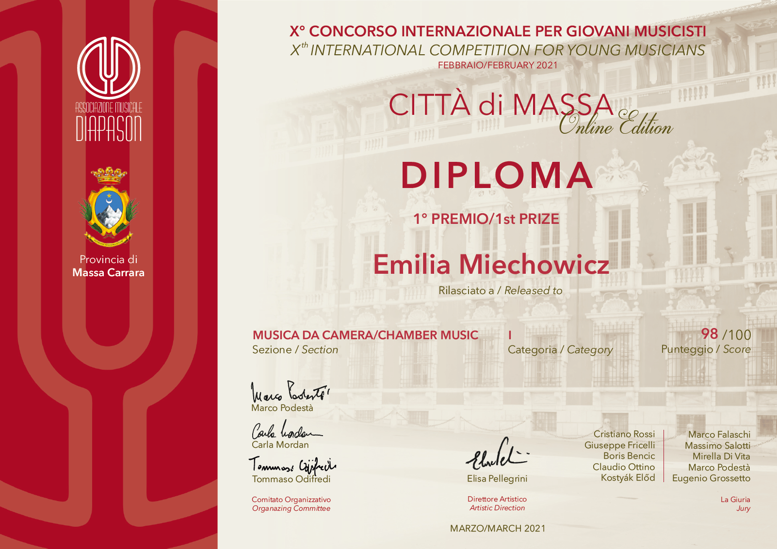 Soliści i zespoły kameralne aMuz zostali laureatami 10° Concorso Internazionale per Giovani Musicisti „Città di Massa” / 10th International Competition for Young Musicians „Città di Massa” (edycja online) w Massa/Włochy (luty-marzec 2021):