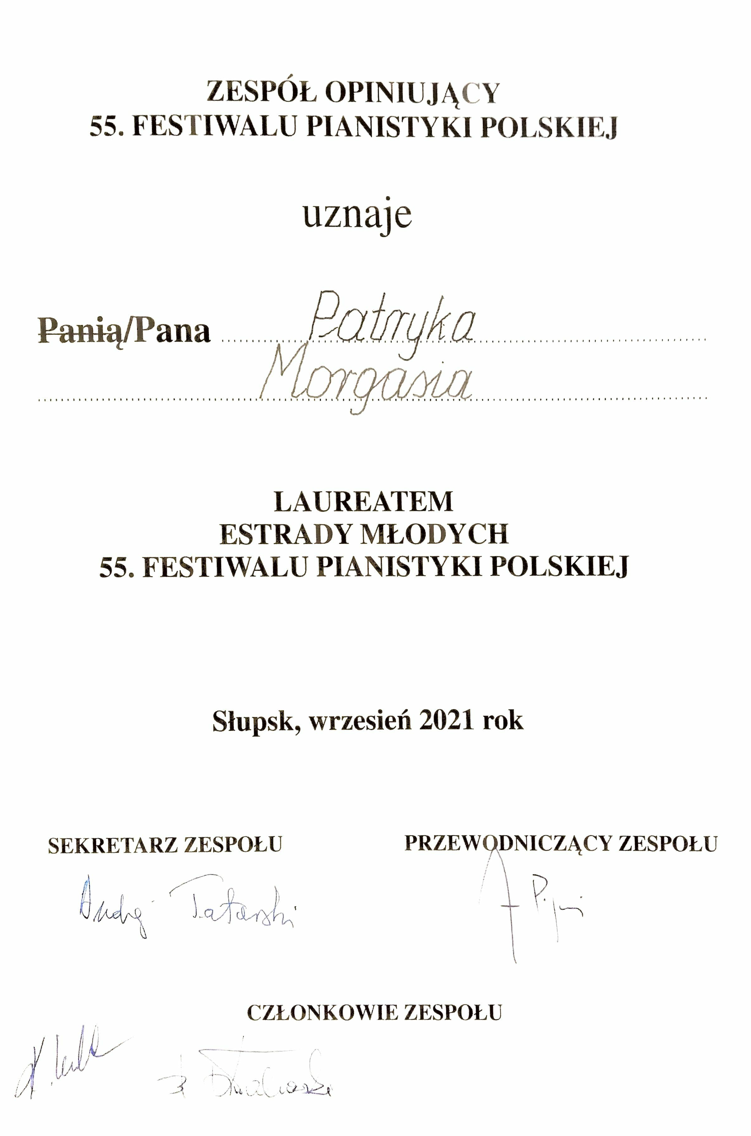 Patryk Morgaś (III rok studiów I st.) z klasy fortepianu dra Kordiana Góry został laureatem Estrady Młodych 55. Festiwalu Pianistyki Polskiej w Słupsku (wrzesień 2021).
