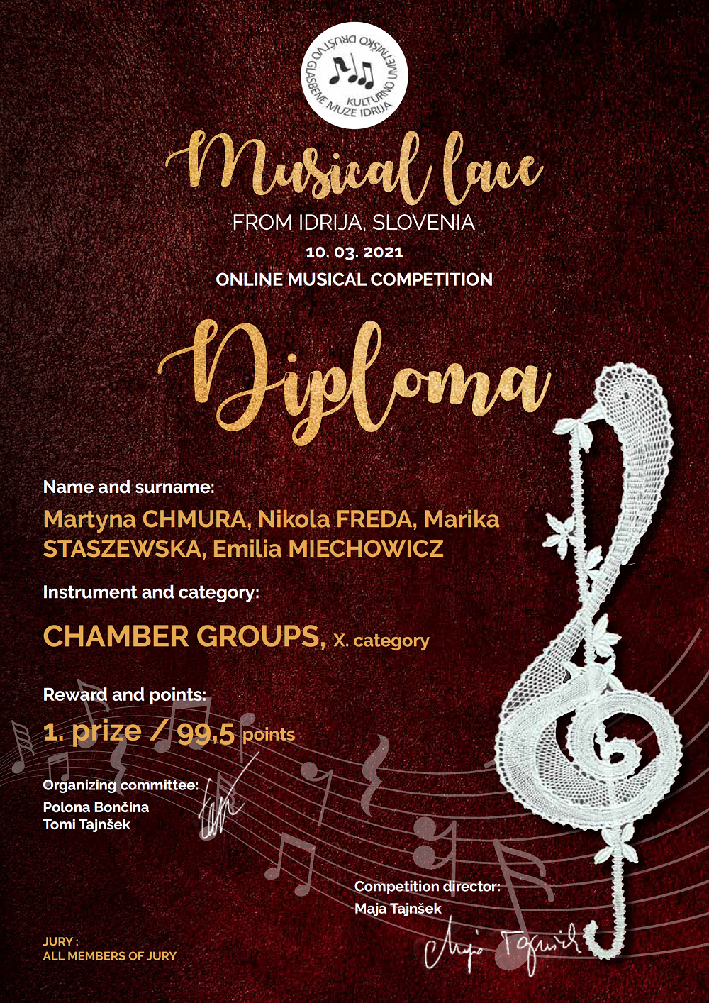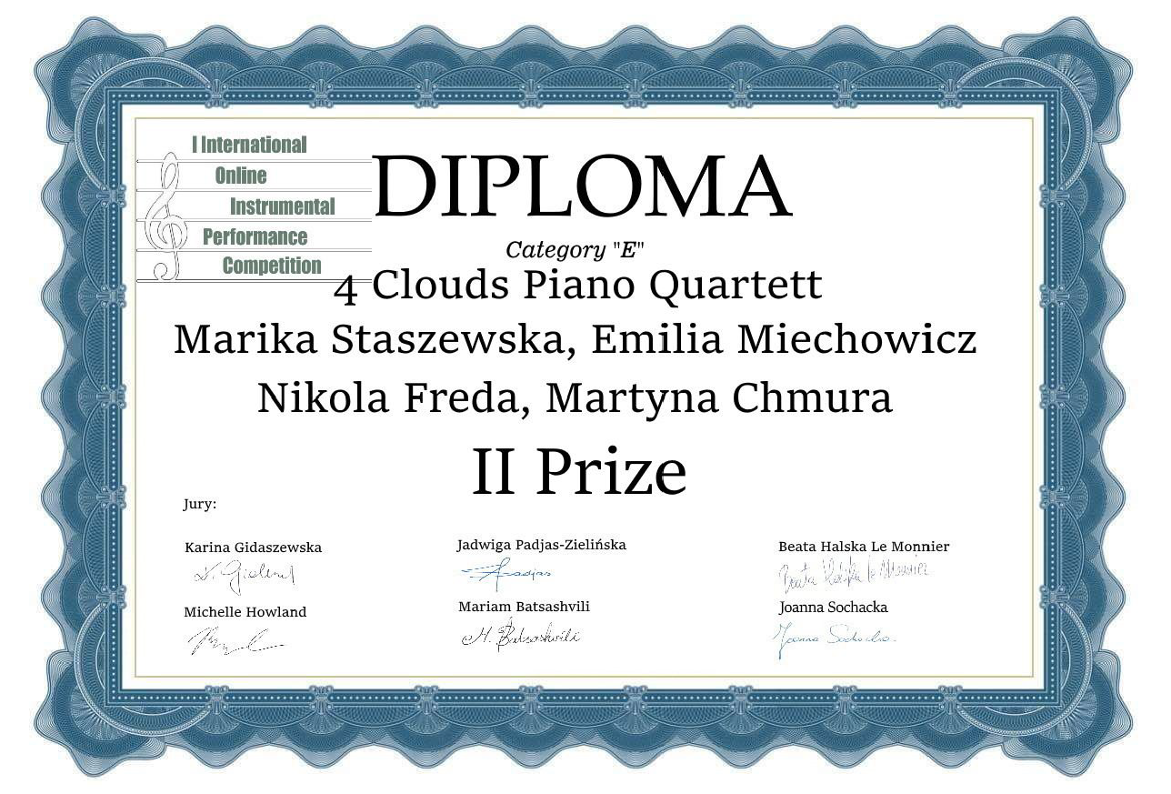 4Clouds Piano Quartett w składzie: Marika Staszewska – skrzypce, Emilia Miechowicz – altówka, Nikola Freda – wiolonczela, Martyna Chmura – fortepian z klasy kameralistyki dr hab. Bogny Czerwińskiej-Szymuli i dra hab. Pawła Kuklińskiego otrzymał I NAGRODĘ w kat. zespoły kameralne na VIII Rome International Music Competition w Rzymie/Włochy (1.05-1.06.2021).