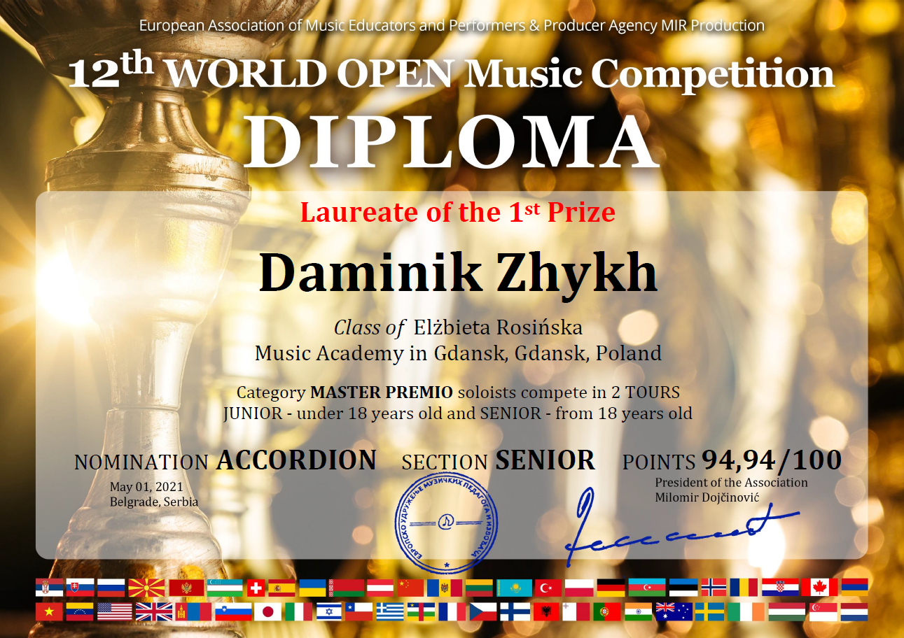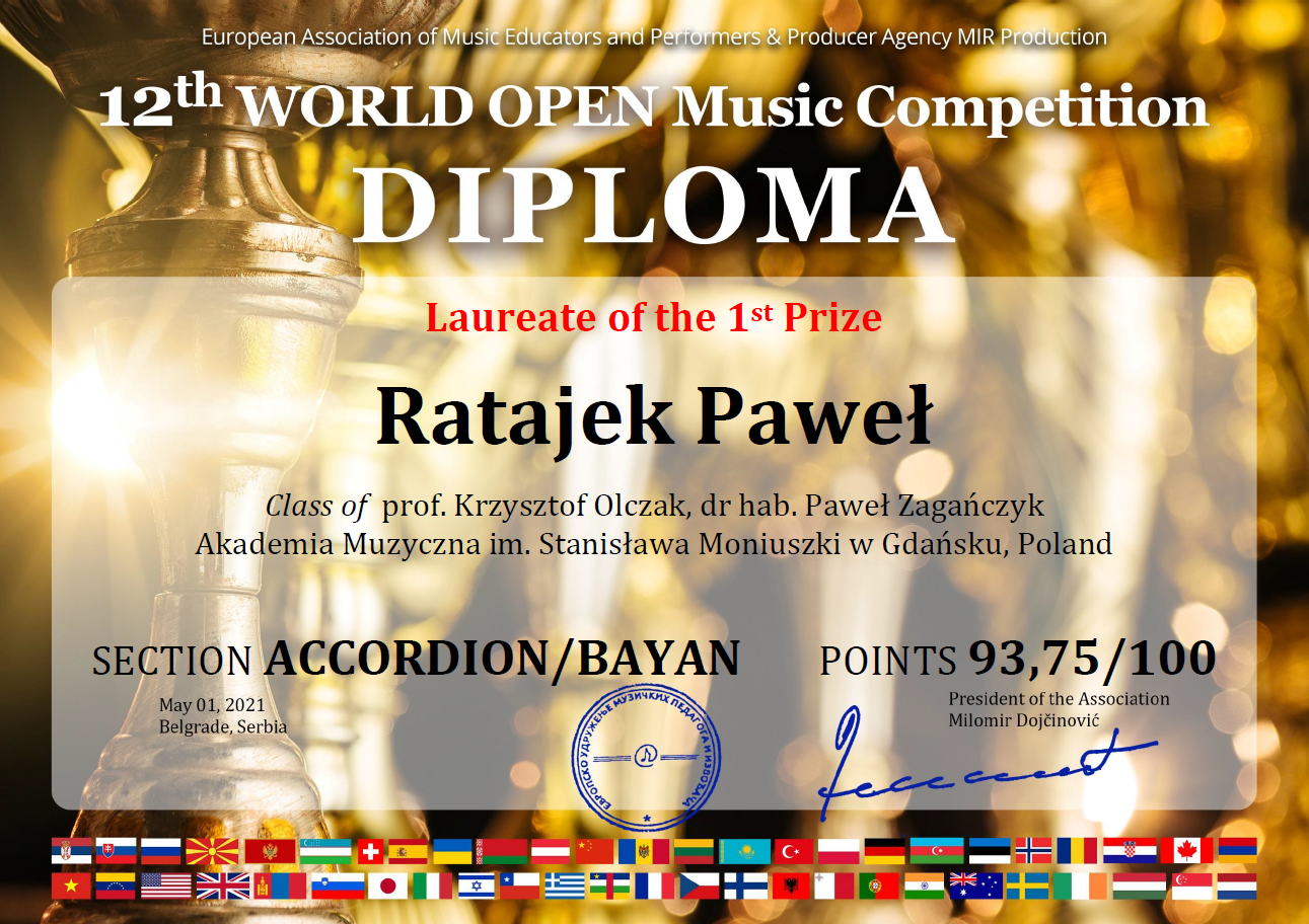 - Paweł Ratajek (II rok studiów II st.) z klasy akordeonu prof. dra hab. Krzysztofa Olczaka i dra hab. Pawła Zagańczyka zdobył II MIEJSCE w kat. V Senior oraz III MIEJSCE w kat. VI Virtuoso Entertainment Music,