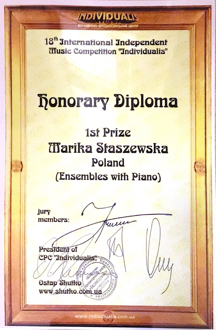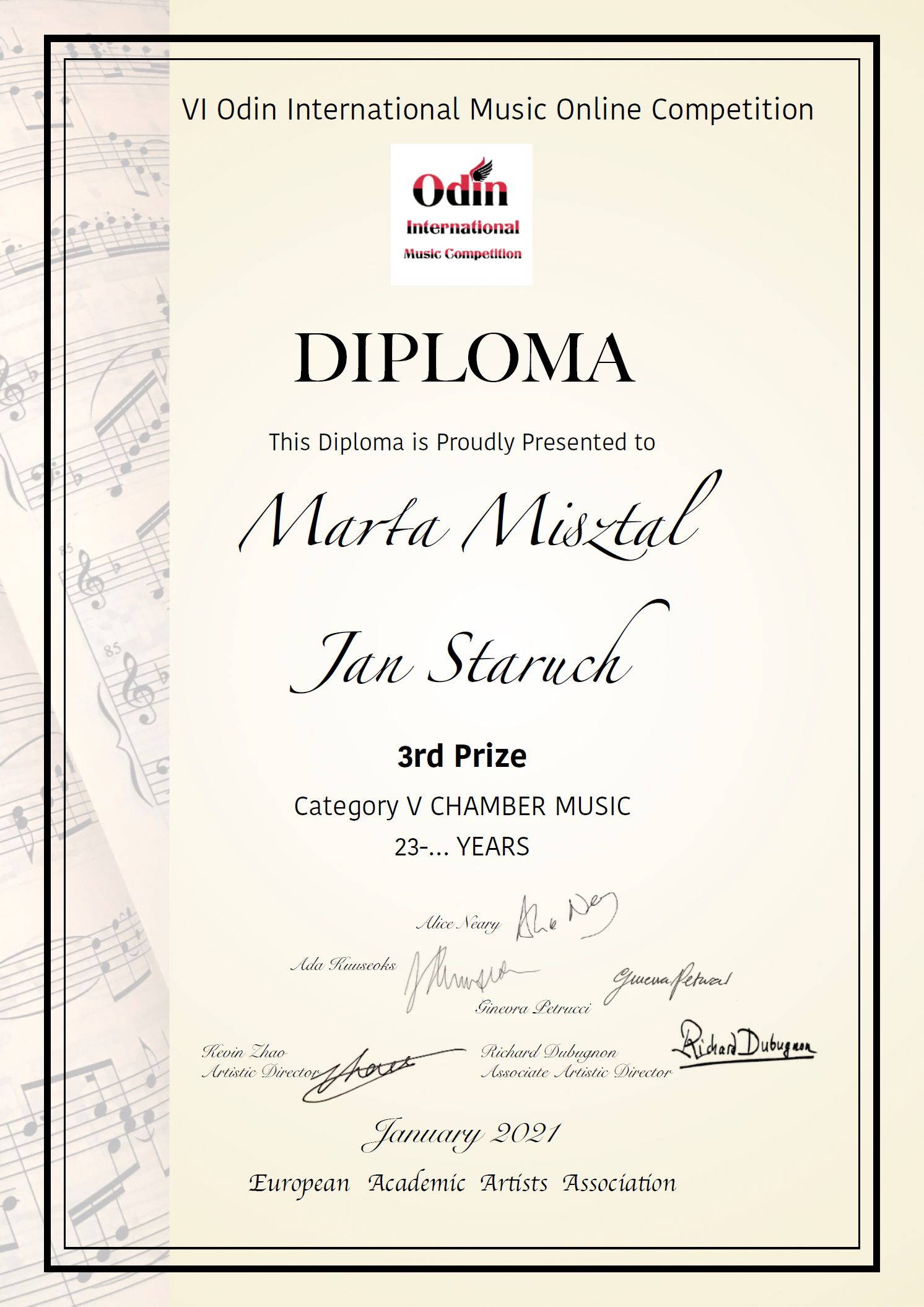 - Duet w składzie: Jan Staruch (II rok studiów II st.) z klasy skrzypiec dr hab. Anny Wandtke-Wypych i dr hab. Karoliny Piątkowskiej-Nowickiej oraz Marta Misztal (II rok studiów II st.) z klasy fortepianu dr hab. Elżbiety Pasierowskiej i mgra Mikołaja Sikały otrzymał II NAGRODĘ w kat. zespoły kameralne w grupie wiekowej Masters;