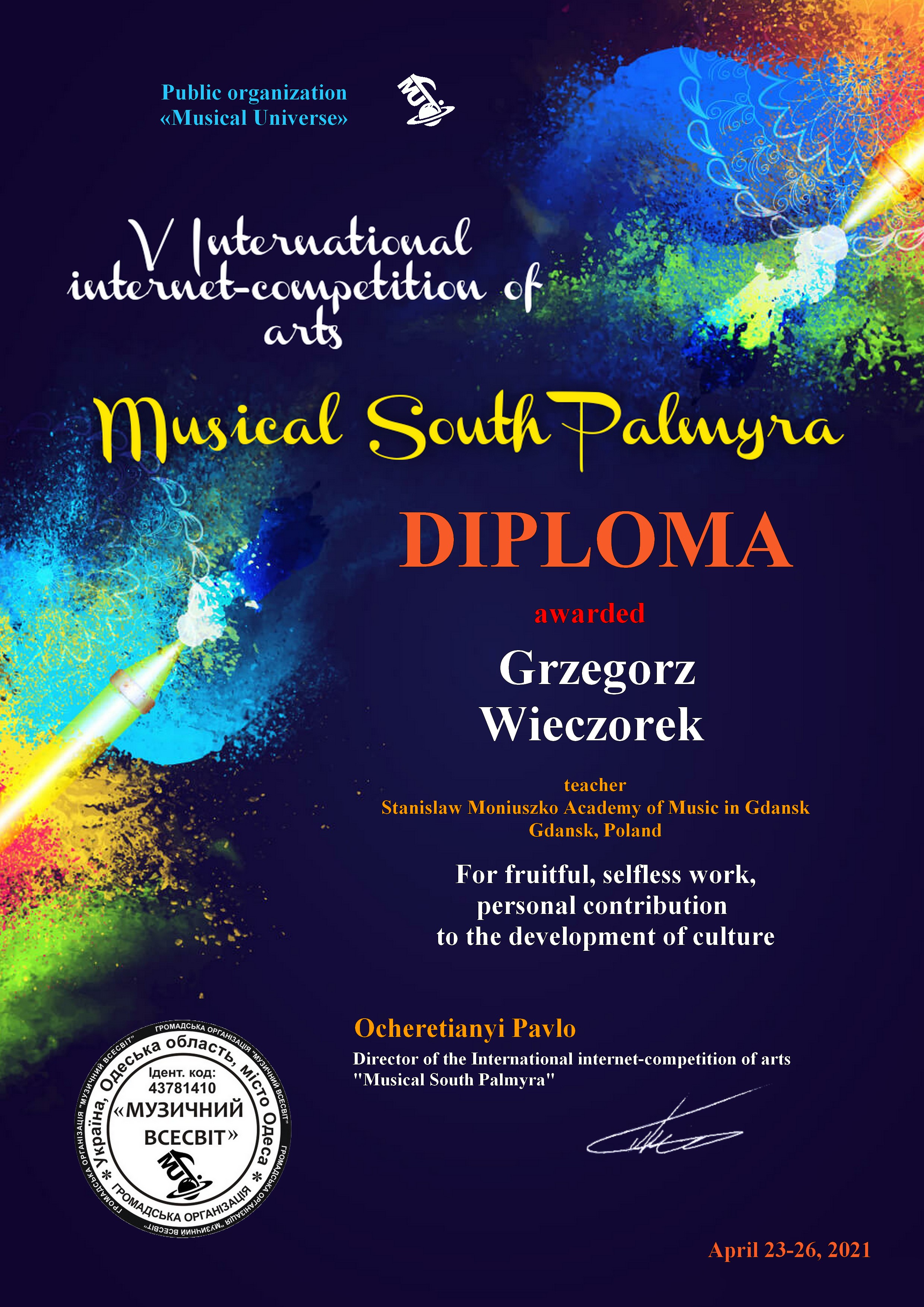 Szymon Wieczorek (I rok studiów I st.) z klasy kompozycji mgra Pawła Mykietyna i klasy klarnetu dra hab. Andrzeja Wojciechowskiego zdobył II NAGRODĘ w kat. VIII kompozycja w gr. wiekowej 19-… na VII Odin International Music Online Competition (sierpień 2021).