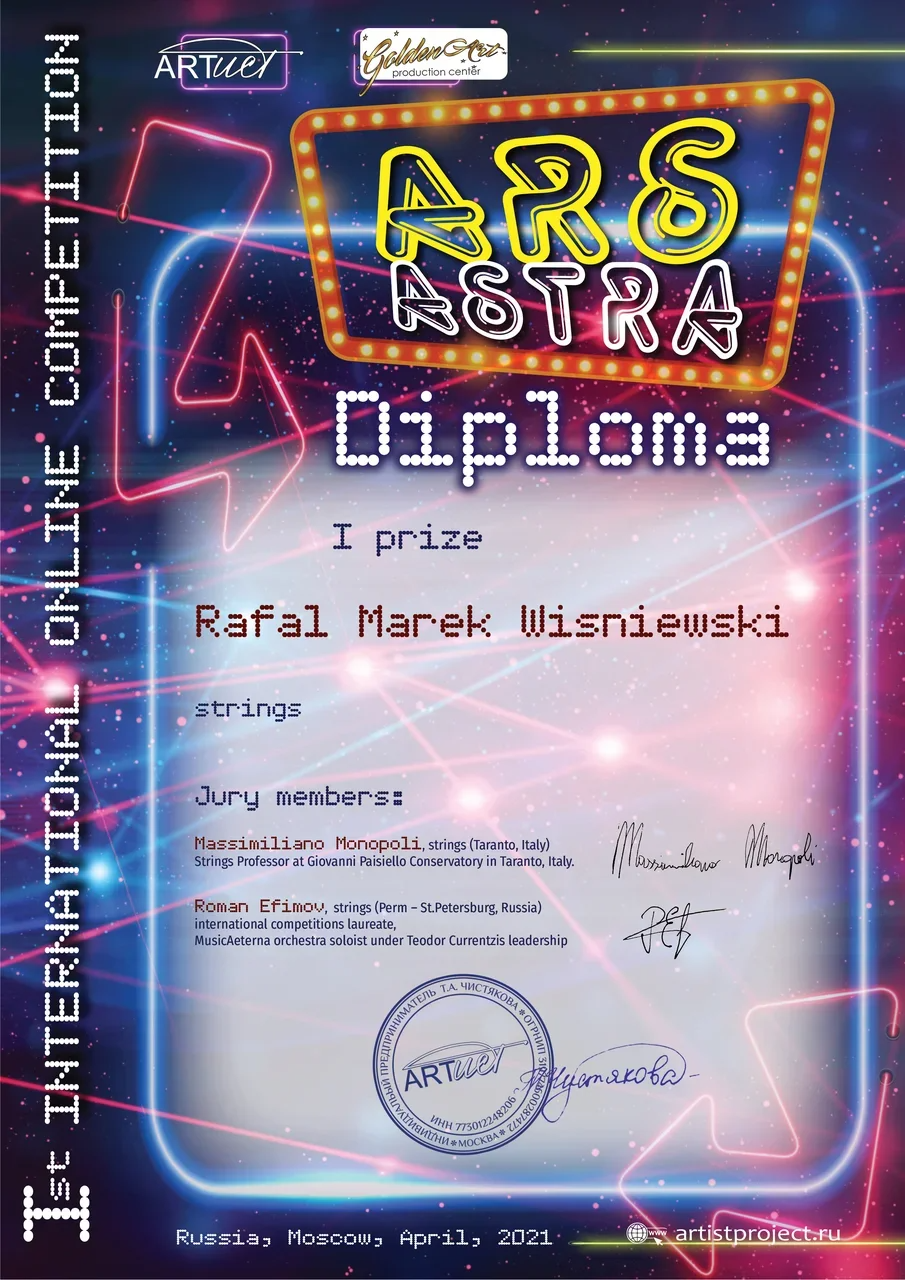 Rafał Marek Wiśniewski (II rok studiów II st.) z klasy skrzypiec prof. dra hab. Wojciecha Szlachcikowskiego i dr hab. Anny Wandtke-Wypych został laureatem II MIEJSCA na International Music Competition Silk-Way named after S. Prokofiev w Moskwie/Rosja (maj 2021). Przy fortepianie podczas nagrania towarzyszył studentowi Piotr Pawlak.
