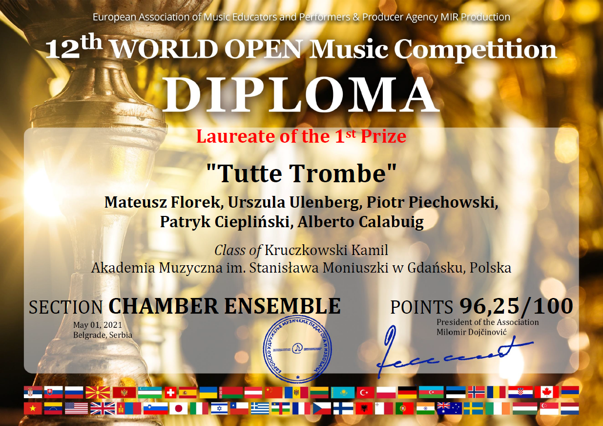 Adam Jankowski (I rok studiów I st.) z klasy puzonu dra Mariana Stefanowicza zdobył II NAGRODĘ w kat. Brass: Trombone, w grupie wiekowej: soliści grupa H (23-25 lat) na MAP International Music Competition 2021 online (10.08-20.09.2021).
