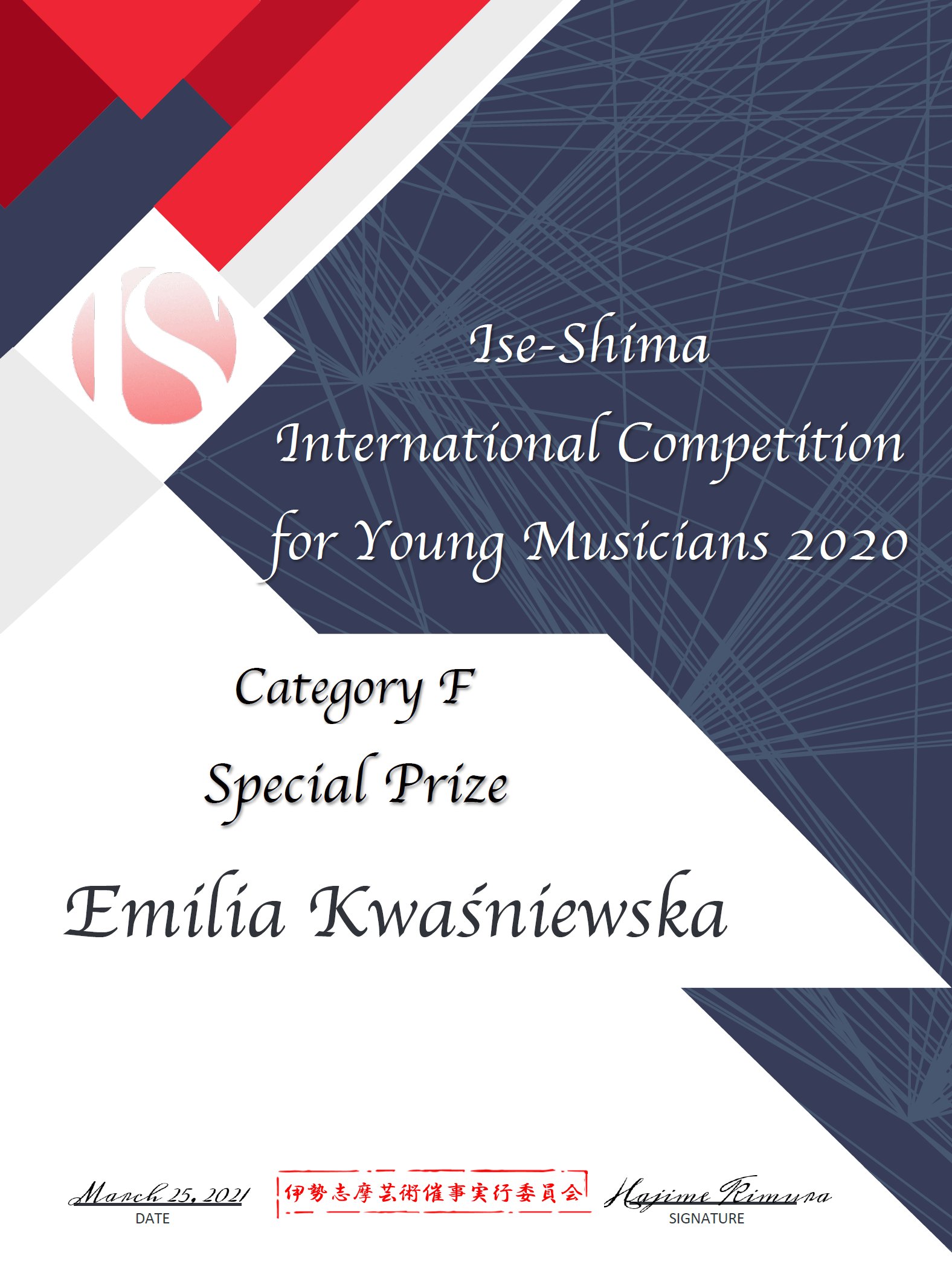 - Yuliya Kazimirovich (absolwentka 2019) z klasy skrzypiec dr hab. Karoliny Piątkowskiej-Nowickiej i dr hab. Anny Wandtke-Wypych otrzymała III NAGRODĘ w kat. smyczki.