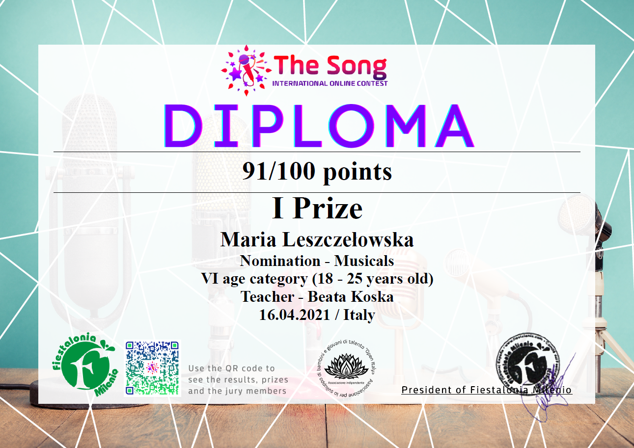 Urszula Laudańska (I rok studiów II st., specjalność musical) z klasy śpiewu dr Beaty Koski została laureatką nagrody GRAND PRIX na III Ogólnopolskim Festiwalu Piosenek Eleni „Po słonecznej stronie życia” w Bielawie (31.10.2021).
