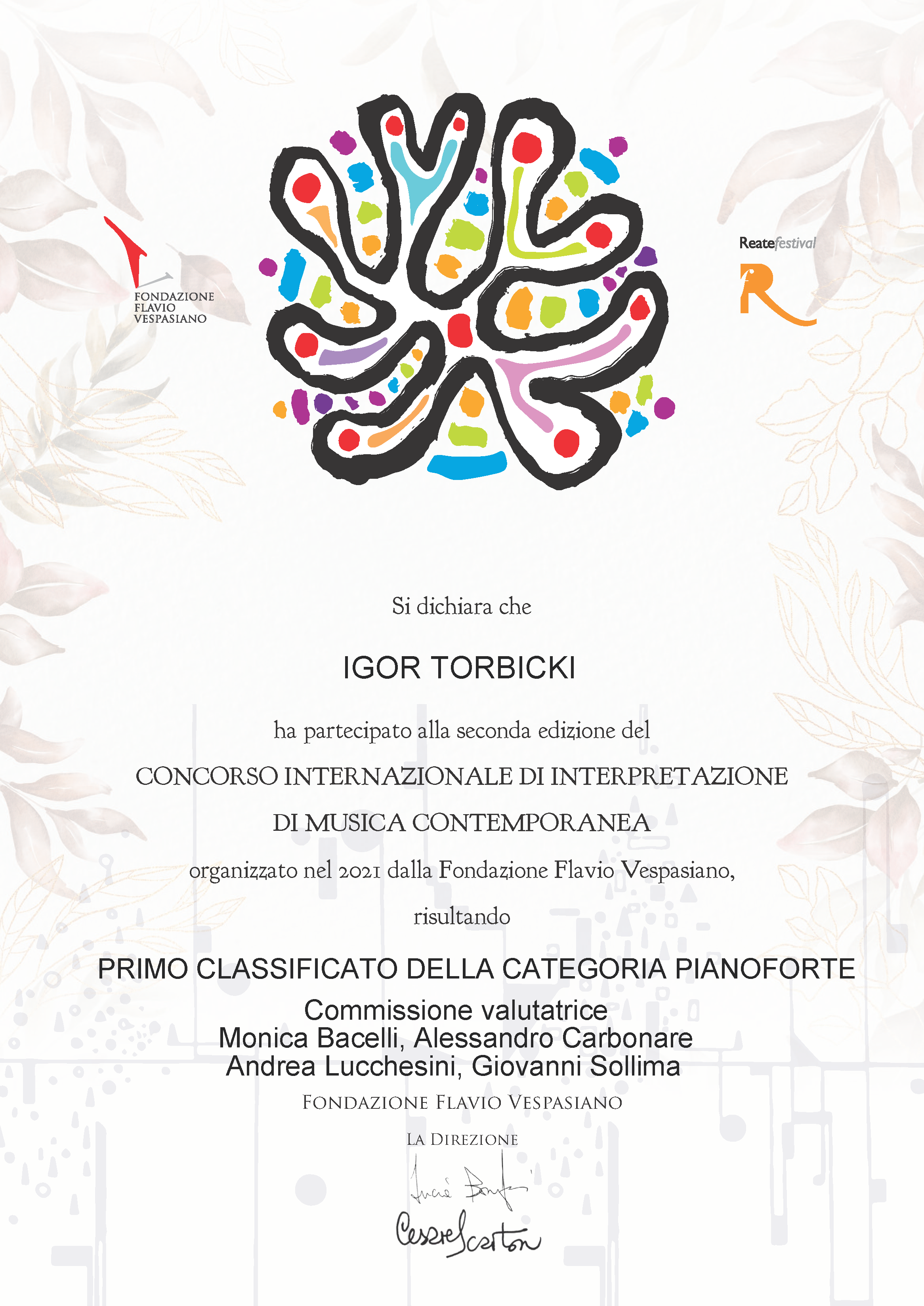 Igor Torbicki (III rok studiów III st.) z klasy fortepianu dra hab. Piotra Słopeckiego został LAUREATEM w kat. fortepian na II Międzynarodowym Konkursie Interpretacji Muzyki Współczesnej / Seconda Edizione Concorso Internazionale Di Interpretazione Di Musica Contemporanea online organizowanym przez Fondazione Flavio Vespasiano we Włoszech (15-30.09.2021). Co istotne, jednym z członków komisji konkursowej był Andrea Lucchesini, wieloletni współpracownik Luciano Berio. Koncert laureatów odbędzie się 24.10.2021 r. w Rieti w ramach Reate Festival.