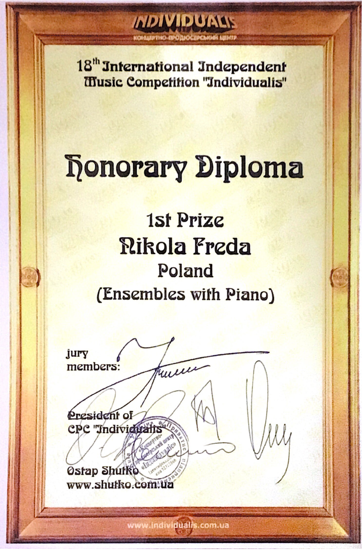 - 4Clouds Piano Quartett w składzie: Marika Staszewska – skrzypce (III rok studiów I st.), Emilia Miechowicz – altówka (I rok studiów II st.), Nikola Freda – wiolonczela (III rok studiów I st.), Martyna Chmura – fortepian (I rok studiów II st.) z klasy kameralistyki dr hab. Bogny Czerwińskiej-Szymuli i dra hab. Pawła Kuklińskiego zdobył WYRÓŻNIENIE w sekcji IV, kat. H.