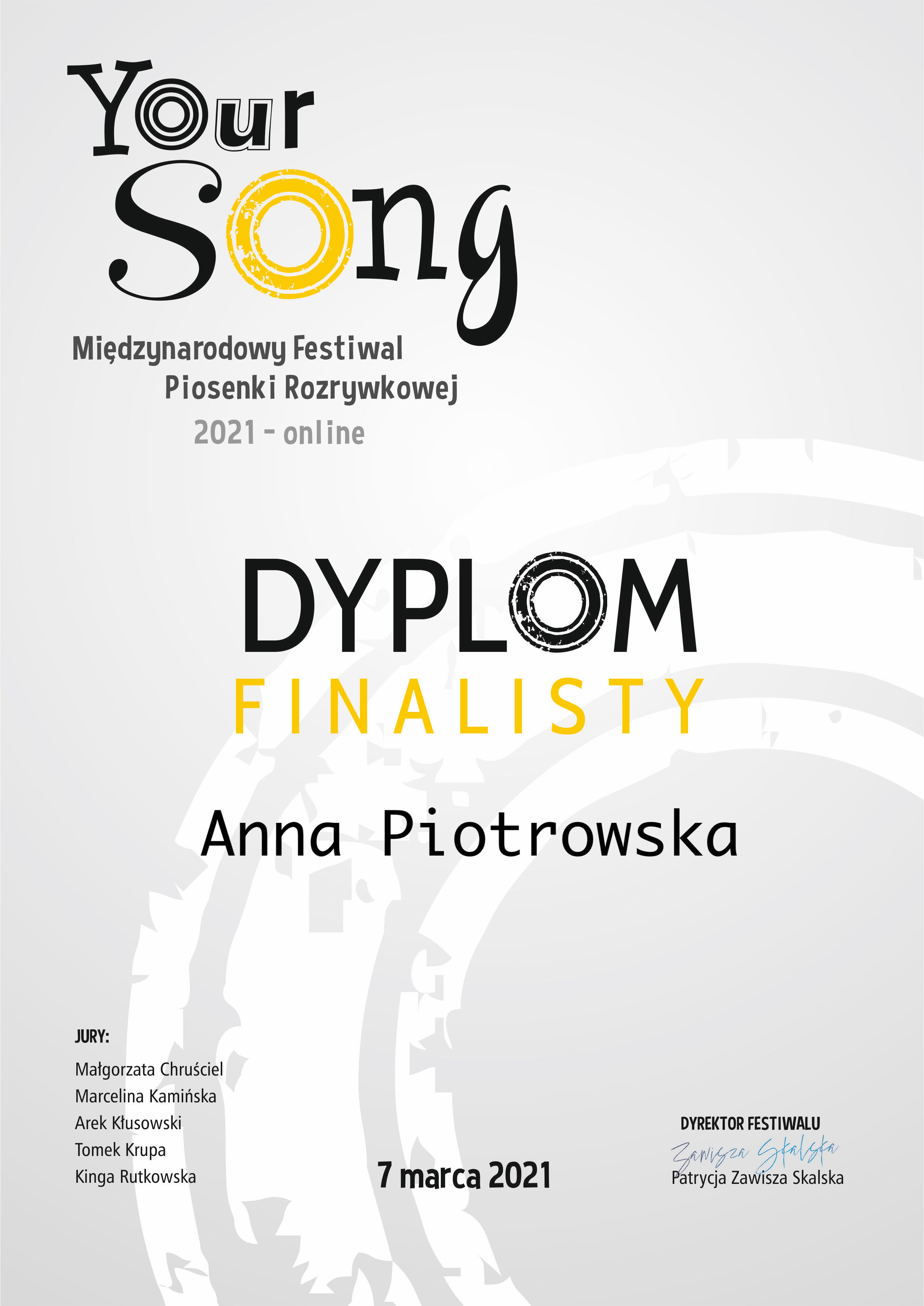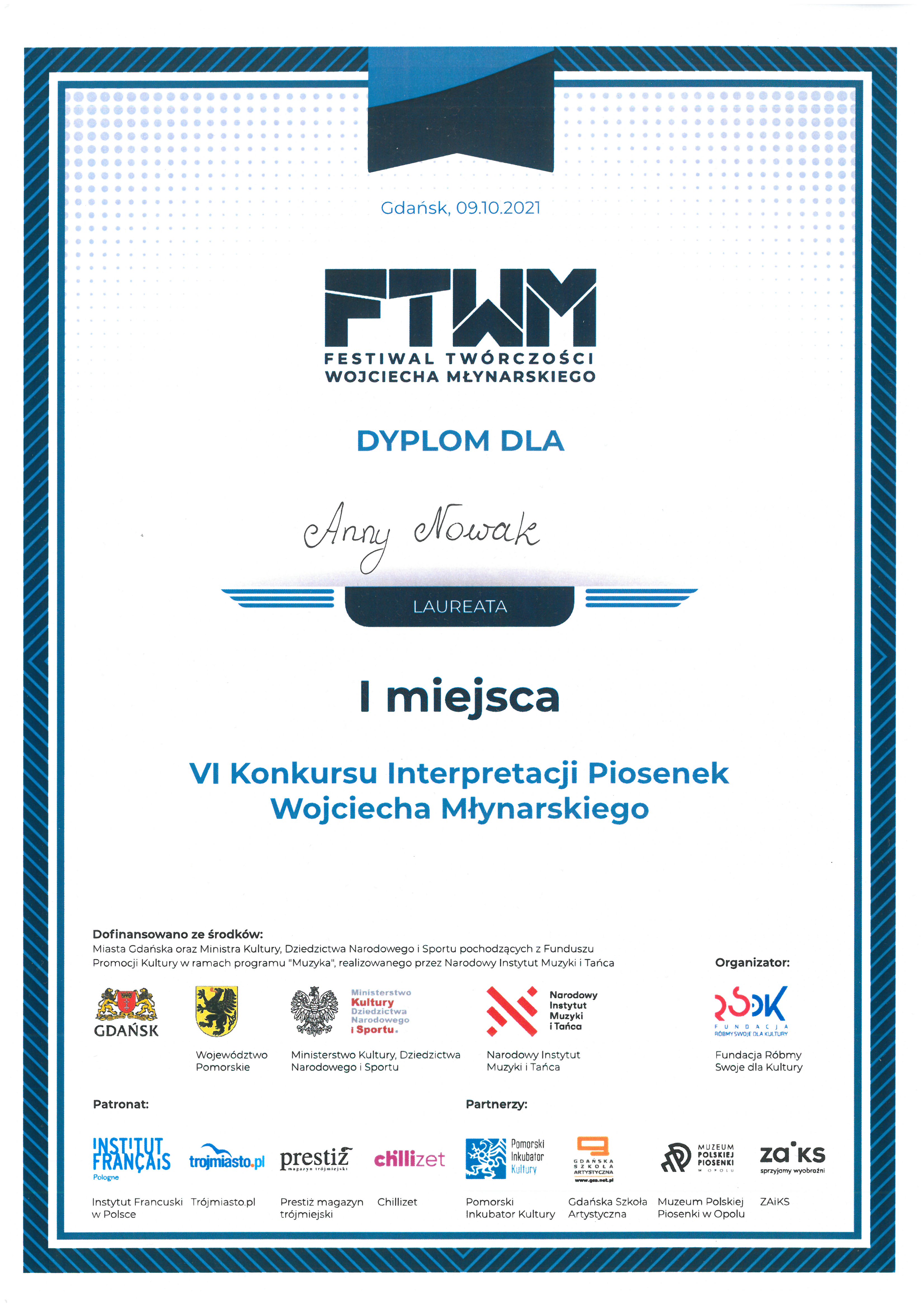 Anna Nowak (IV rok studiów I st., specjalność musical) z klasy śpiewu dra Miłosza Gałaja i mgr Anastazji Simińskiej została laureatką I MIEJSCA na VI Konkursie Interpretacji Piosenek Wojciecha Młynarskiego w ramach VI Festiwalu Twórczości Wojciecha Młynarskiego w Gdańskim Teatrze Szekspirowskim (8-9.10.2021). Organizatorem Konkursu jest Fundacja Róbmy Swoje Dla Kultury, a jego przebiegowi patronował Instytut Francuski w Polsce. Anna Nowak w finale zaprezentowała utwór „Cyganeria” Charlesa Aznavoura w tłumaczeniu Wojciecha Młynarskiego. W jury zasiadali Magda Umer, Agata Kulesza i Emil Młynarski.