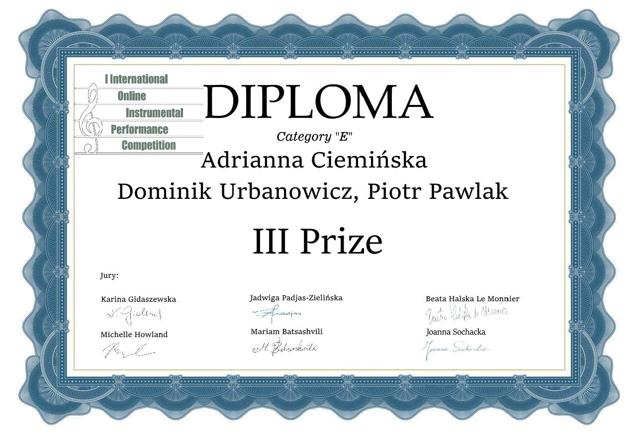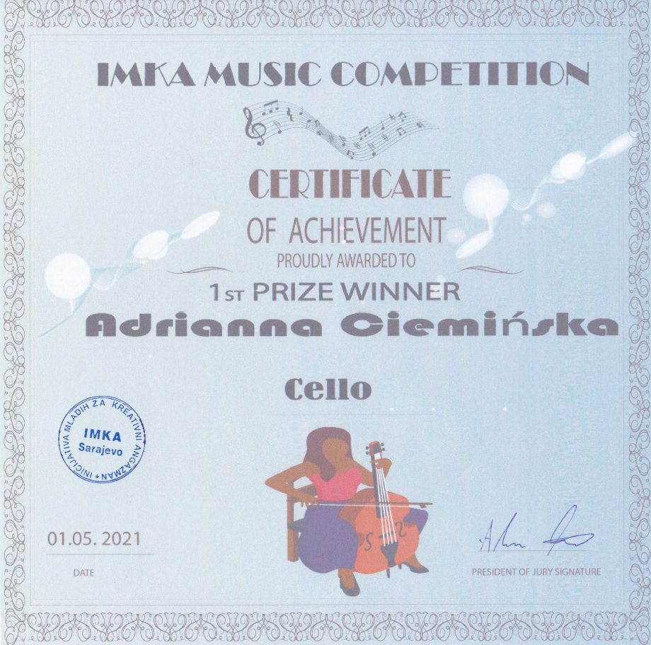 - Adrianna Ciemińska (III rok studiów I st.) z klasy wiolonczeli prof. dra hab. Marcina Zdunika i mgra Macieja Kułakowskiego zdobyła III NAGRODĘ w kat. solowej;