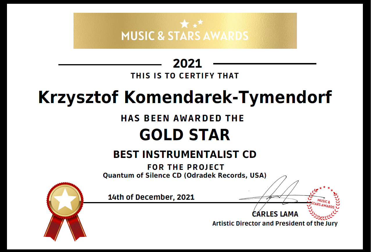 Na tym samym Konkursie dr hab. Krzysztof Komendarek-Tymendorf otrzymał GOLD STAR w kat. BEST INSTRUMENTALIST CD za płytę „Quantum of Silence” (Odradek Records, USA).