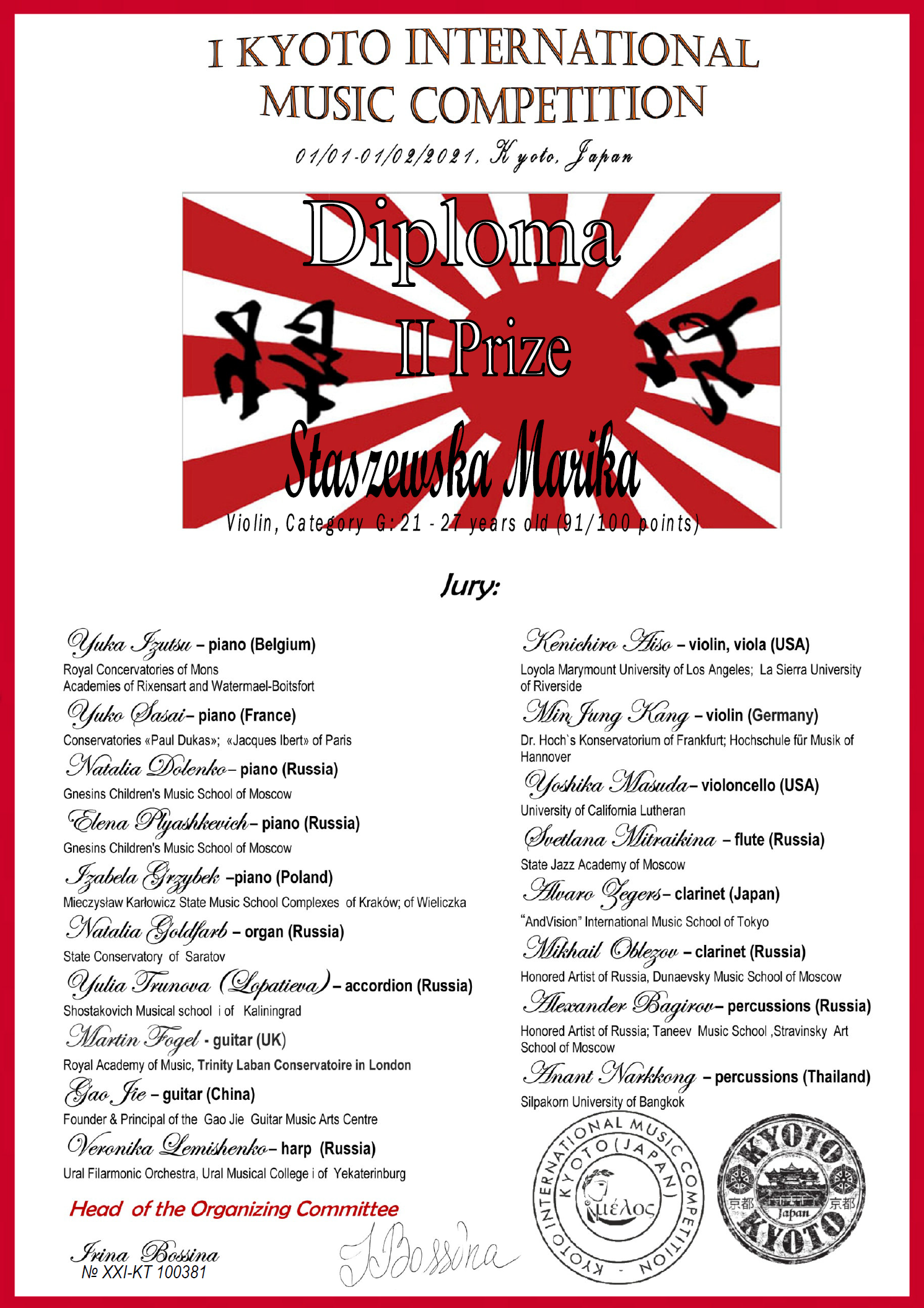 - Marika Staszewska (III rok studiów I st.) z klasy skrzypiec dra hab. Pawła Kuklińskiego zdobyła II NAGRODĘ w sekcji II, kat. D. Przy fortepianie towarzyszyła studentce mgr Justyna Korpak;