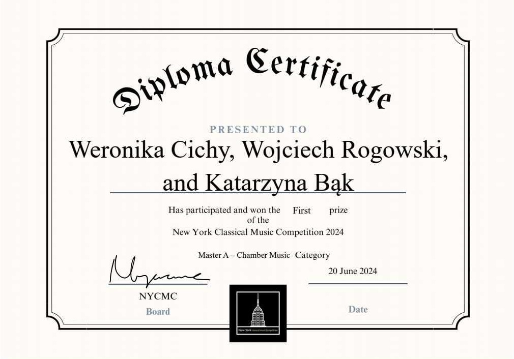 Trio w składzie: Weronika Cichy (I rok studiów II st.) – klarnet, Wojciech Rogowski (I rok studiów II st.) – skrzypce, Katarzyna Bąk (I rok studiów II st.) – fortepian z klasy kameralistyki prof. dr hab. Anny Prabuckiej-Firlej i dra Adama Bruderka zdobyło I NAGRODĘ w kat. Master A - Chamber Music na New York Classical Music Competition 2024 (20.06.2024).