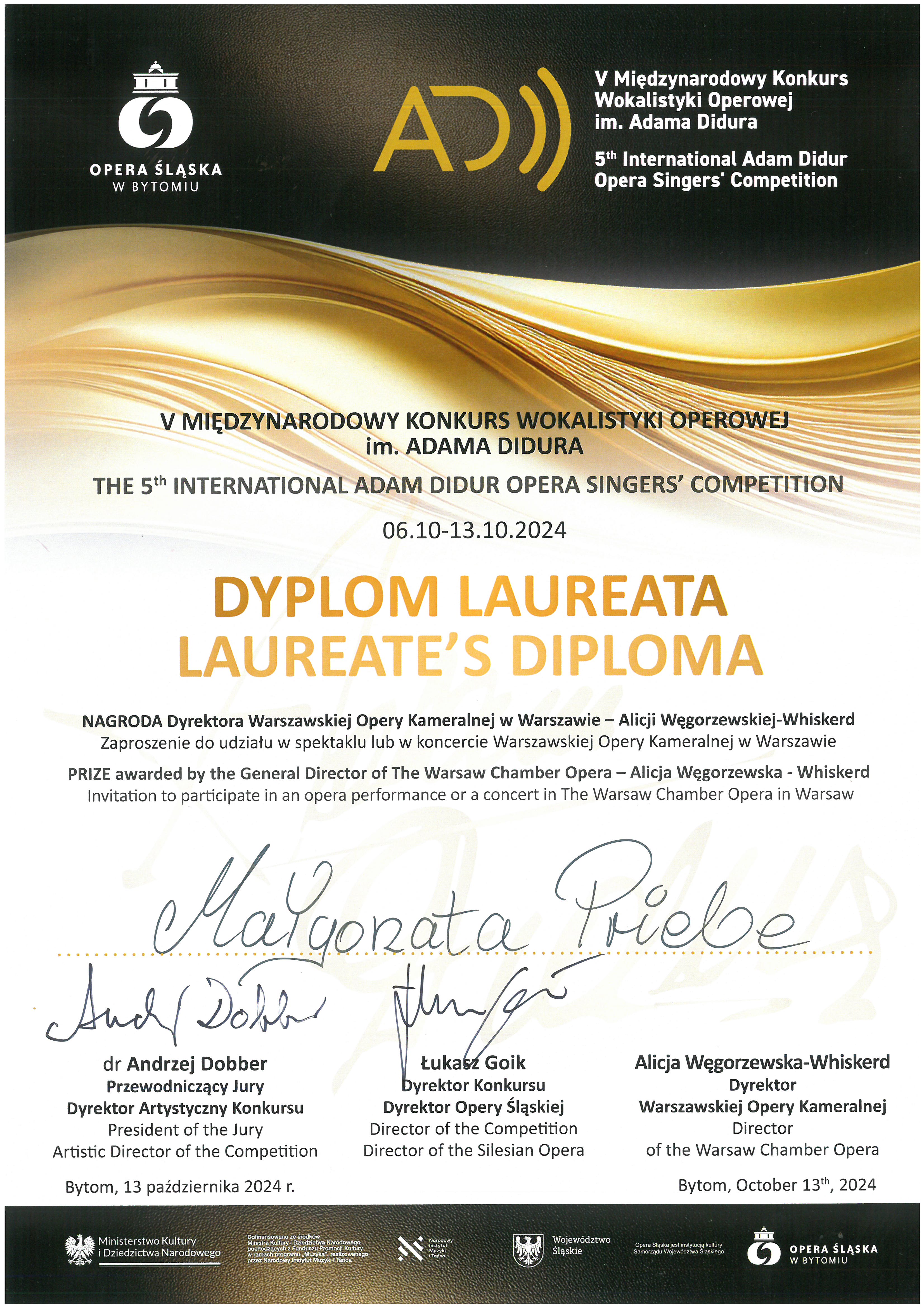 Mgr Małgorzata Priebe, pedagożka oraz uczestniczka Szkoły Doktorskiej aMuz (I rok), została LAUREATKĄ V Międzynarodowego Konkursu Wokalistyki Operowej im. Adama Didura w Akademii Muzycznej im. Karola Szymanowskiego w Katowicach – I etap, oraz Operze Śląskiej w Bytomiu – II etap i finał (6–13.10.2024). Finałowa dwunastka została wybrana przez jury po trzech etapach przesłuchań spośród 56 śpiewaków reprezentujących 13 krajów.