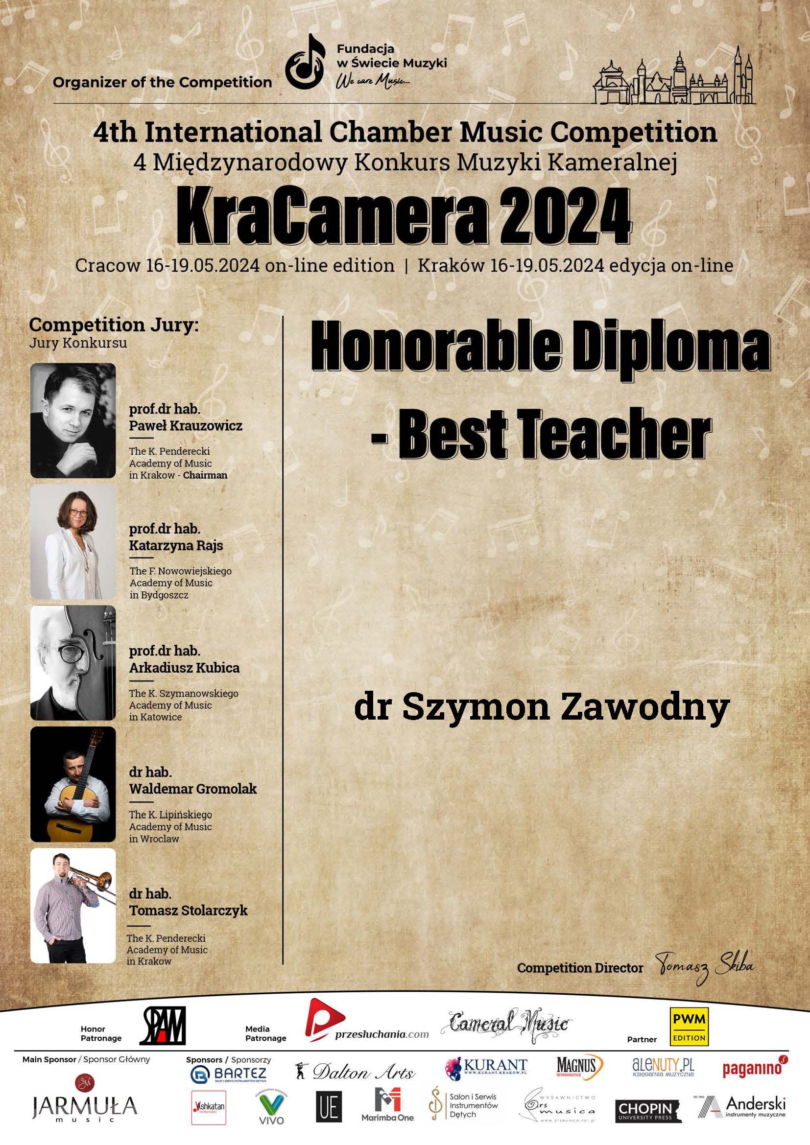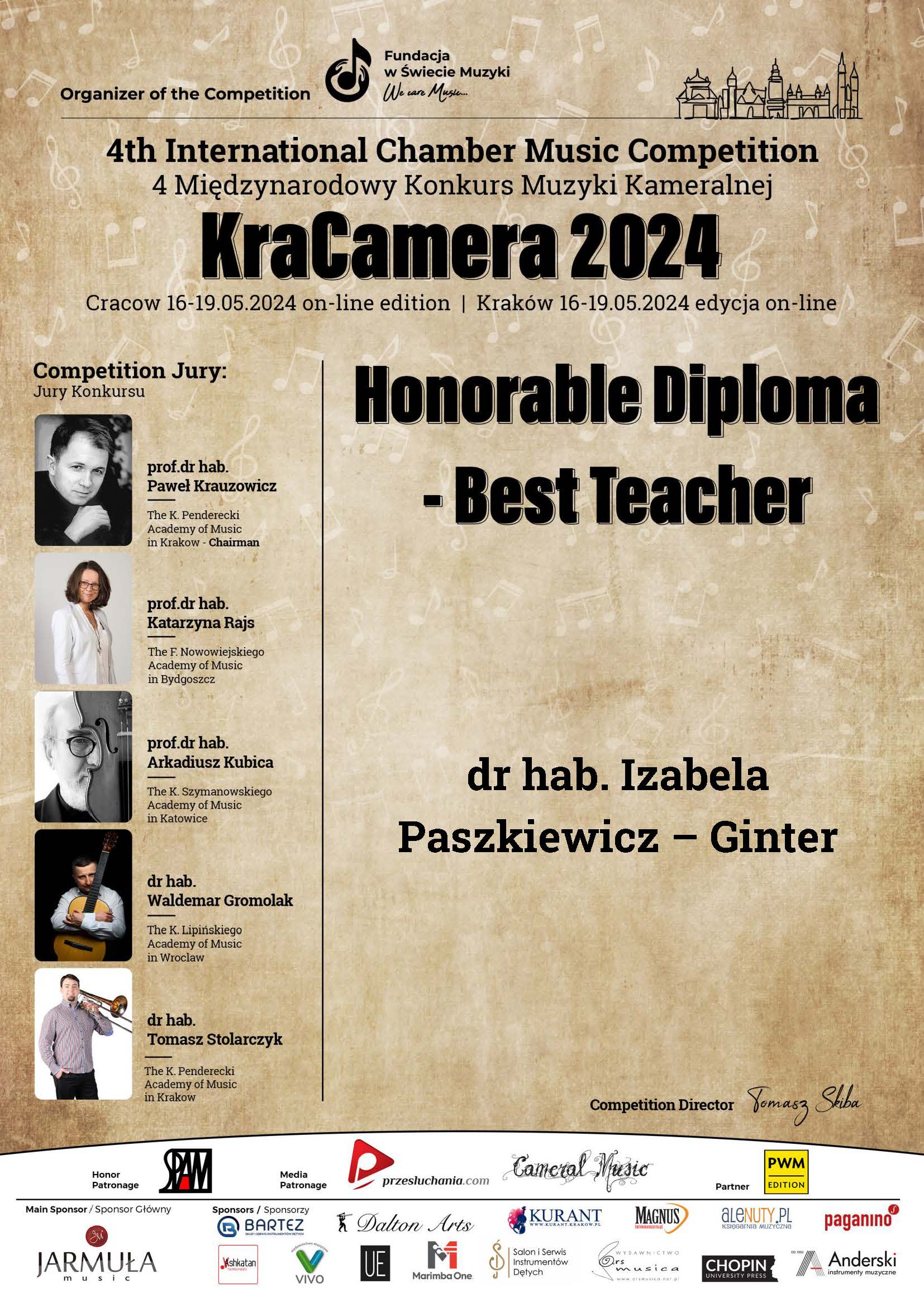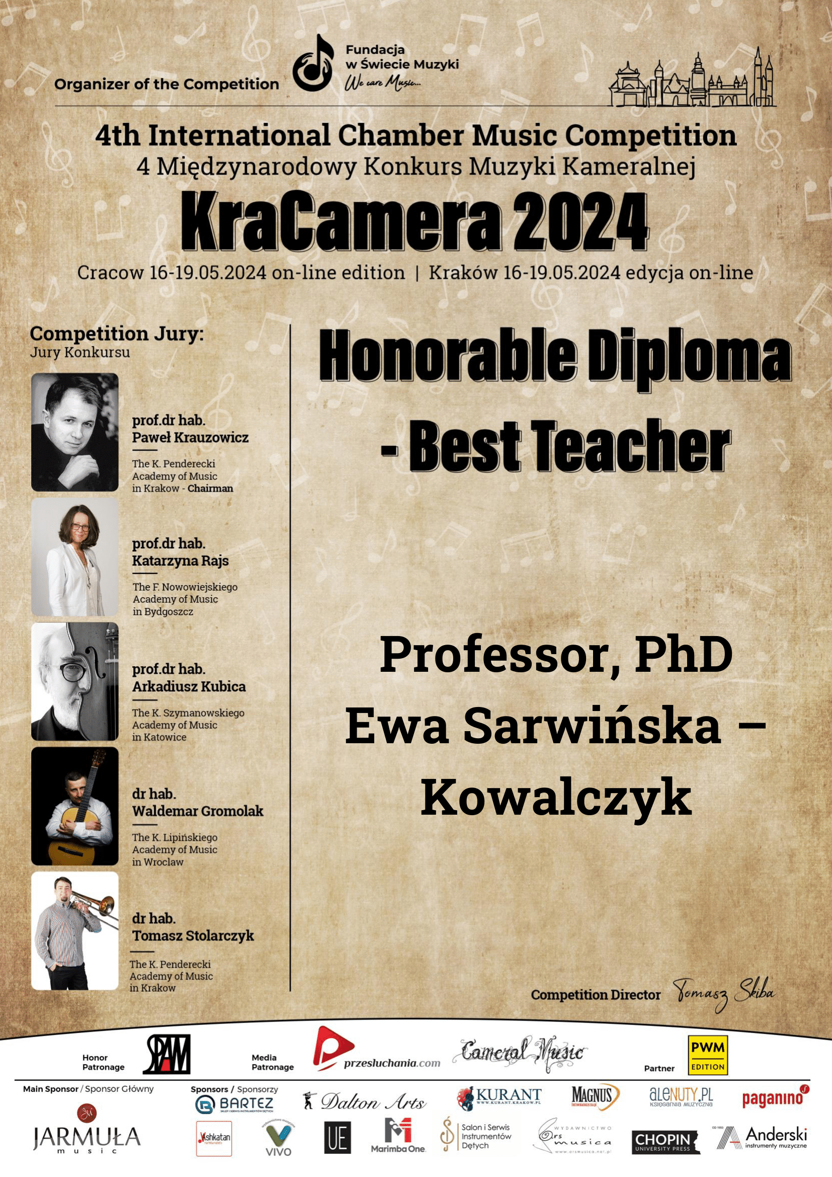 Zespół all'TRE Trio w składzie: Justyna Pląder (III rok studiów I st.) – skrzypce, Oliwia Serkowska (I rok studiów II st.) – wiolonczela, Lāsma Monika Meldere (I rok studiów II st.) – fortepian, z klasy kameralistyki dr Ewy Sarwińskiej-Kowalczyk, dr Pauli Preuss i prof. Sebastiana Hamanna zdobył WYRÓŻNIENIE na 4. Międzynarodowym Konkursie Muzyki Kameralnej KraCamera – edycja online (16-19.05.2024).