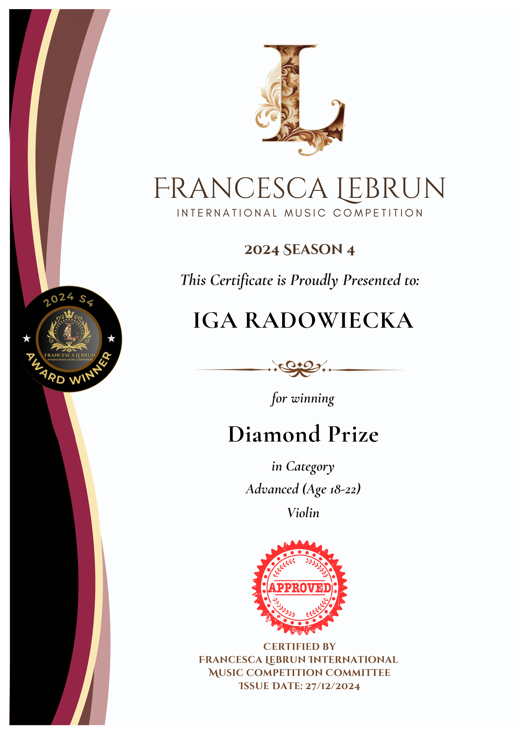 Iga Radowiecka (I rok studiów I st.) z klasy skrzypiec prof. dr hab. Małgorzaty Skorupy zdobyła DIAMOND PRIZE w kat. Advanced (Age 18-22) podczas Francesca Lebrun International Music Competition 2024 Season 4 w Niemczech online (27.12.2024).