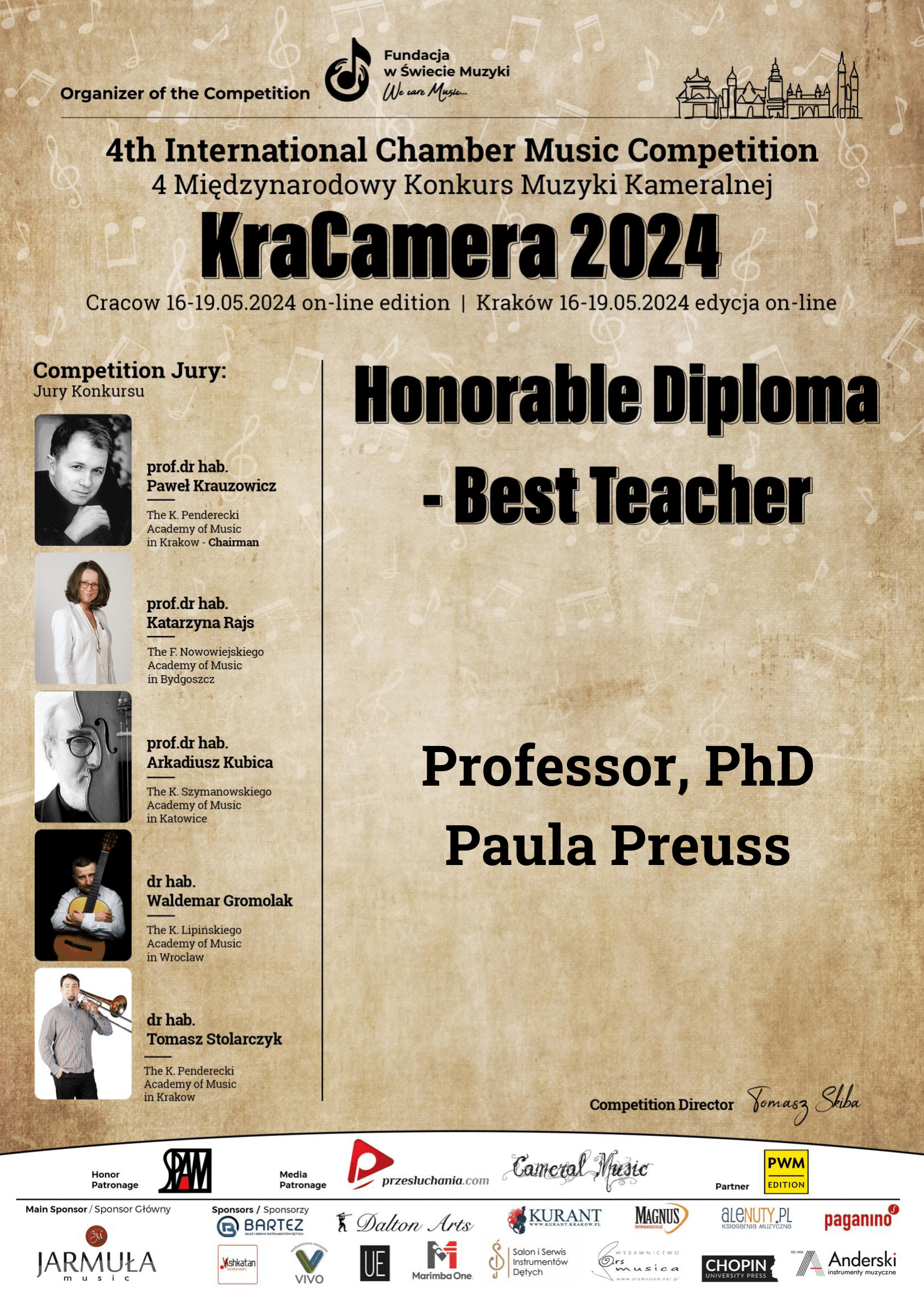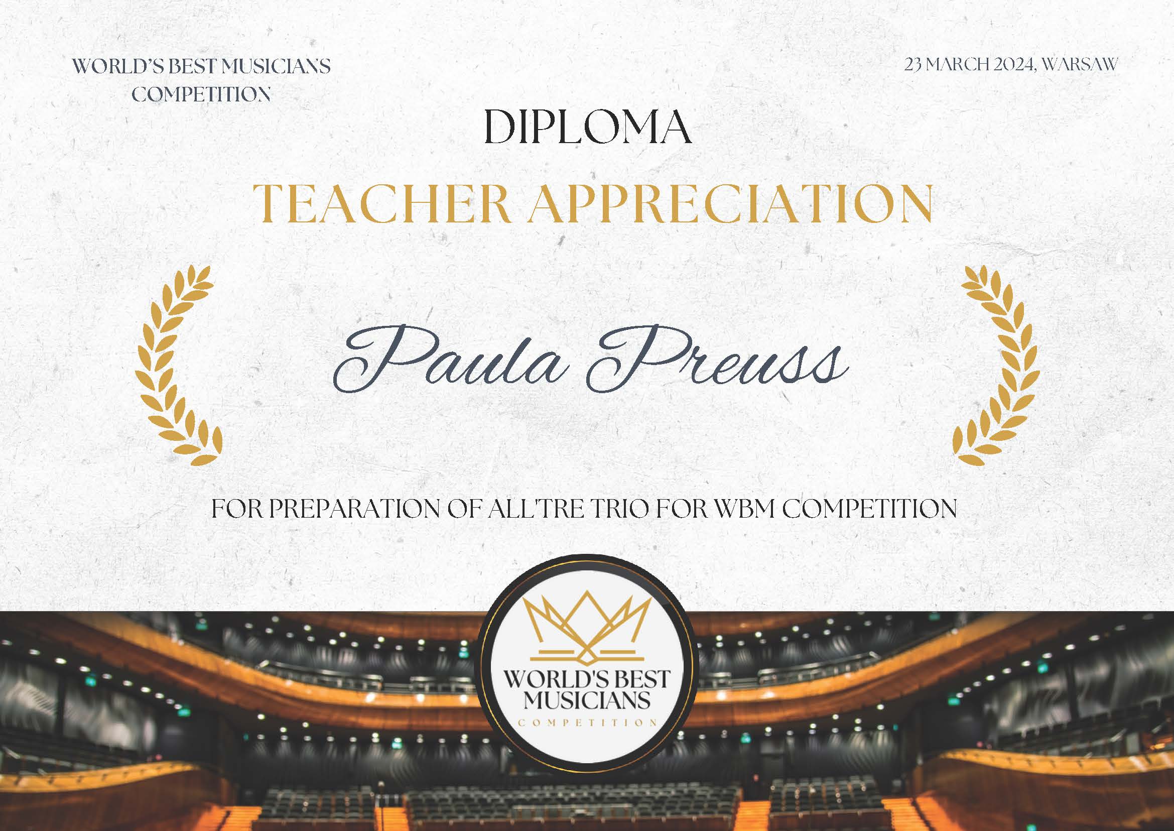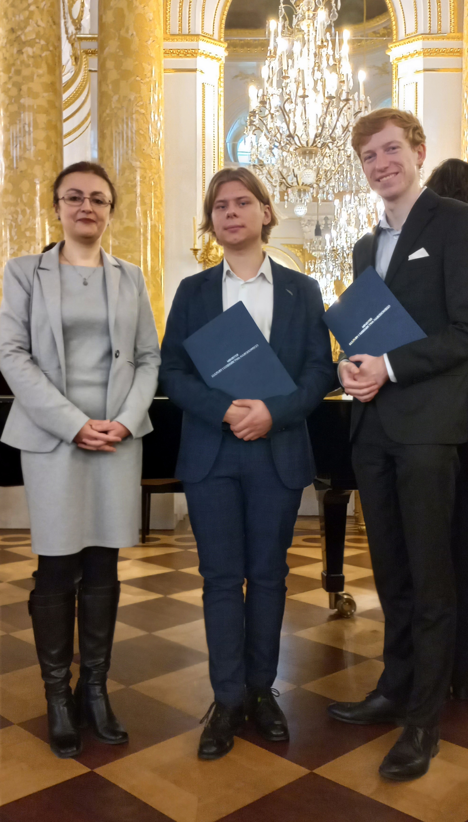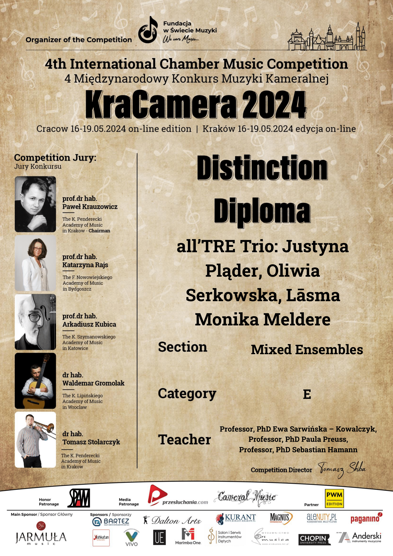 all'TRE Trio w składzie: Justyna Pląder – skrzypce (III rok studiów I st.), Oliwia Serkowska – wiolonczela (I rok studiów II st.), Lāsma Monika Meldere – fortepian (I rok studiów II st.) z klasy kameralistyki dr Ewy Sarwińskiej-Kowalczyk i dr Pauli Preuss otrzymało WYRÓŻNIENIE w kat. zespoły kameralne na 4th International Music Competition Małopolska 2024 Online w Krakowie (4–5.02.2024).