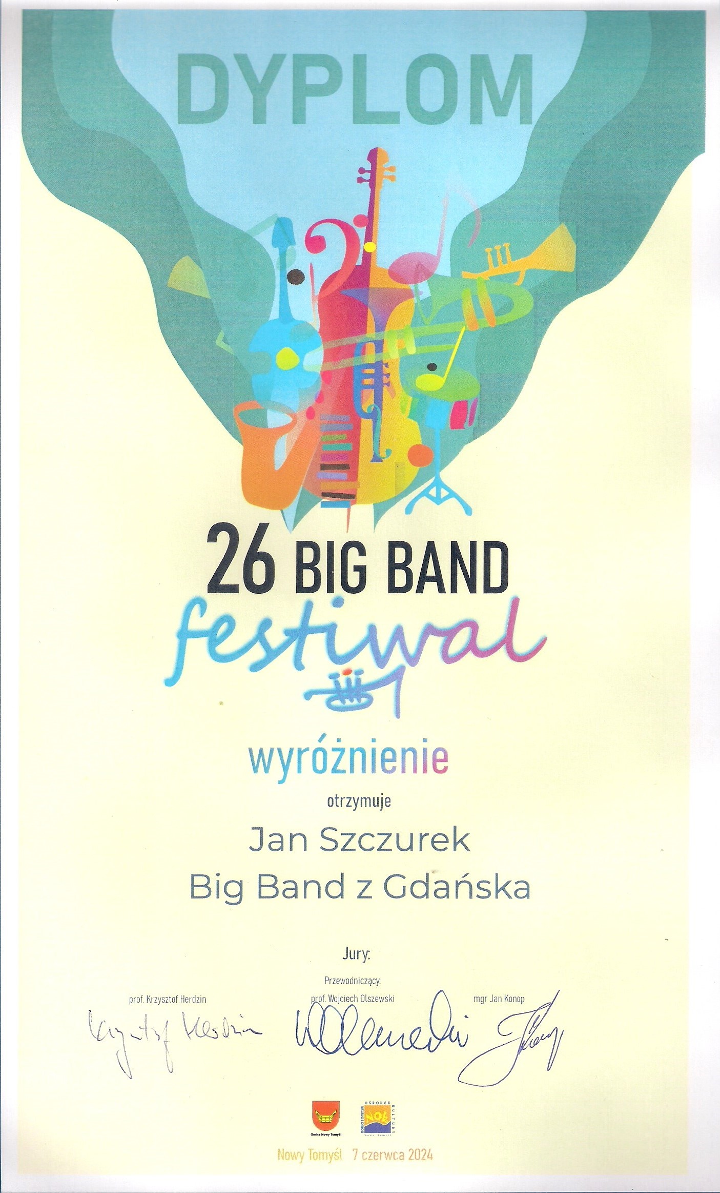 Jan Szczurek Big Band prowadzony przez Jana Szczurka (student II roku studiów II st. z klasy trąbki jazzowej dra Jerzego Małka, absolwent studiów II st. na specjalności kompozycja i aranżacja z klasy dr Aleksandry Tomaszewskiej, 2019, oraz studiów I st. na specjalności wokalistyka jazzowa w klasie śpiewu mgr Joanny Gorczycy, 2015) otrzymał WYRÓŻNIENIE na 26. Big Band Festiwalu w Nowym Tomyślu (7.06.2024). Podczas konkursowego występu Big Band zagrał w składzie: Dawid Maksim, Jakub Semeniuk, Bartosz Drzemicki – trąbki, Karolina Krzyżanowska – flet, Maja Podraska – saksofon altowy, Maksymilian Wilk, Mateusz Chorążewicz – saksofony tenorowe, Adam Jankowski, Wiktor Hoffman – puzony, Konrad Daszczyński – gitara elektryczna, Jan Szczurek – fortepian, kompozycja, aranżacja, Filip Arasimowicz – kontrabas, Wojciech Warmijak – perkusja.