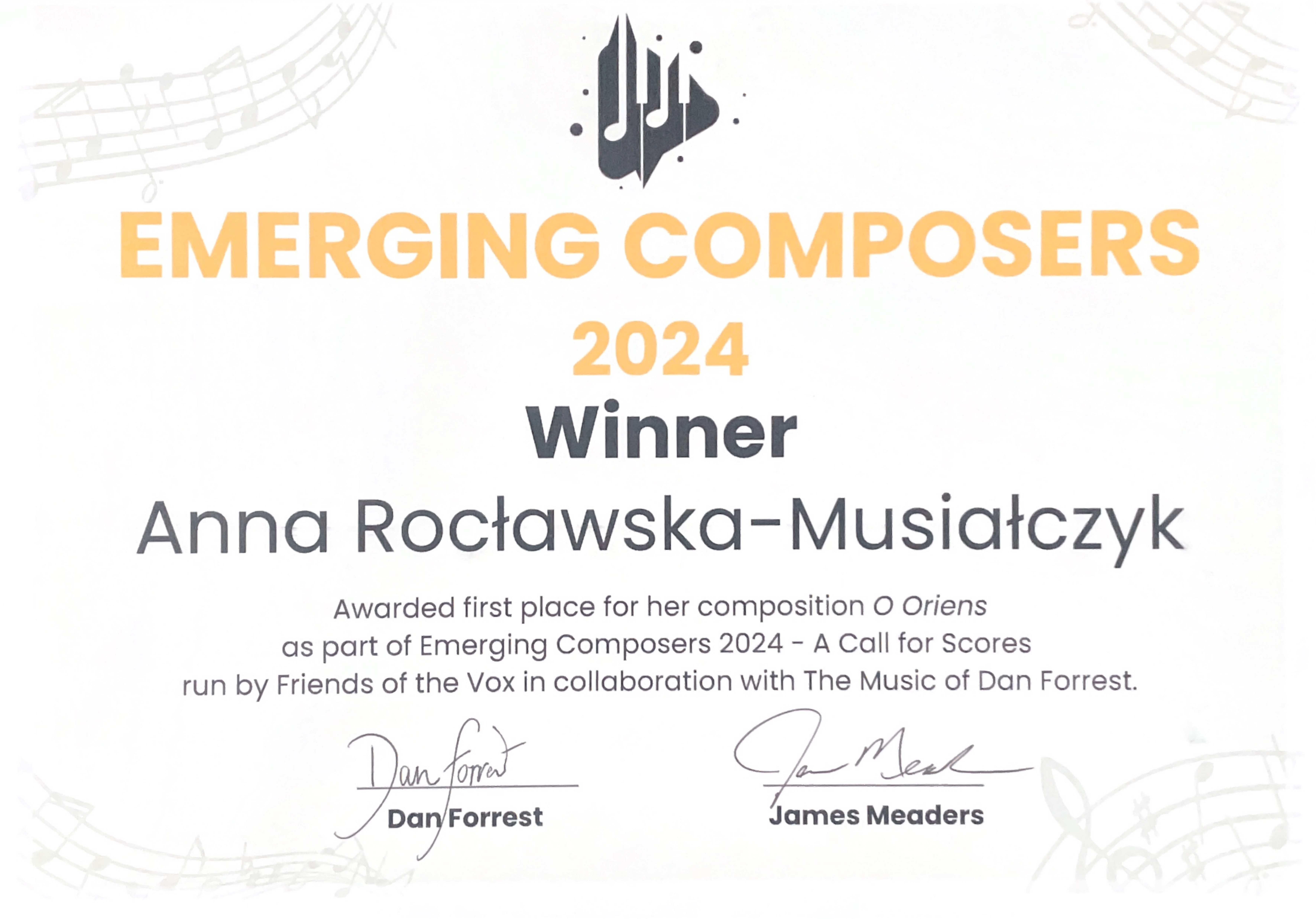 Mgr Anna Rocławska-Musiałczyk, pedagog aMuz, została laureatką I NAGRODY za utwór O Oriens w międzynarodowym programie Emerging Composers 2024 organizowanym przez Friends of the Vox we współpracy z Dan Forrest Music (USA–UK). Na konkurs nadesłano 100 kompozycji z 19 krajów. Utwory laureatów będą premierowo wykonane i nagrane w Londynie przez Vox Anima Chamber Choir w trakcie ich sezonu 2024/2025.