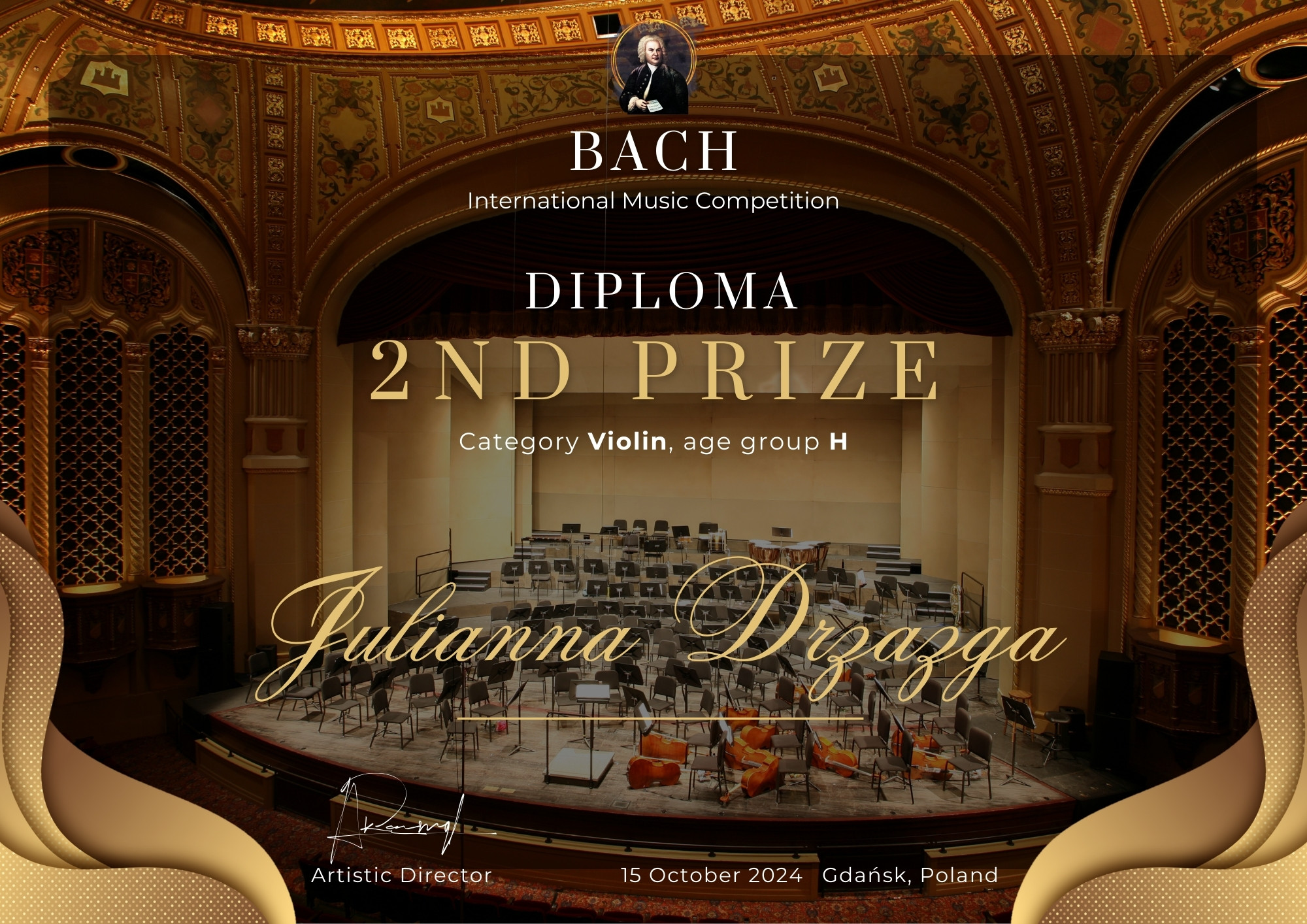 Julianna Drzazga (I rok studiów II st.) z klasy skrzypiec prof. dra hab. Macieja Sobczaka zdobyła II MIEJSCE w kat. skrzypce, grupie wiekowej H na Bach International Music Competition (15.10.2024).