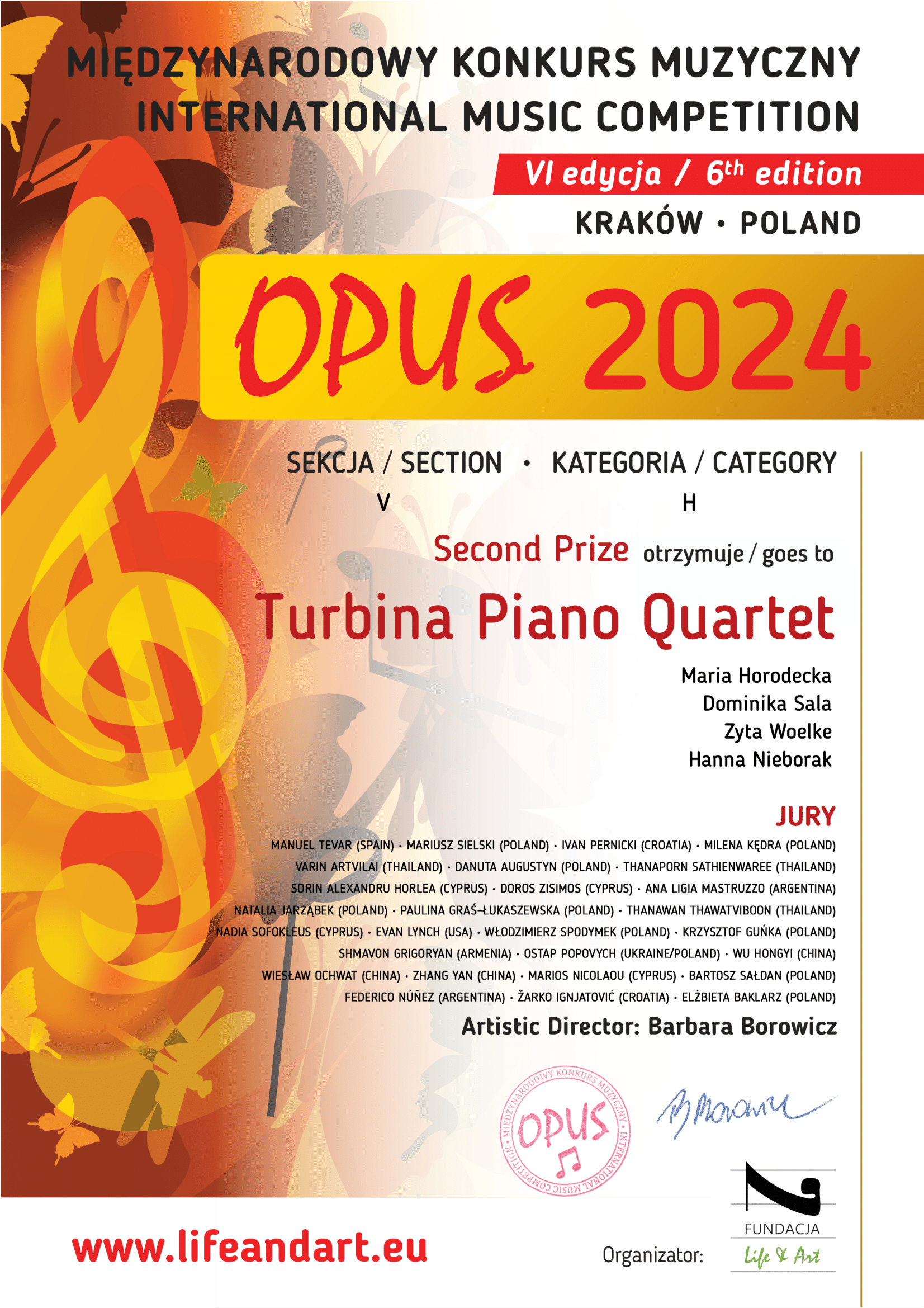 Turbina Piano Quartet w składzie: Dominika Sala (III rok studiów I st.) – skrzypce, Zyta Woelke (III rok studiów I st.) – altówka, Hanna Nieborak (III rok studiów I st.) – wiolonczela, Maria Horodecka (III rok studiów I st.) – fortepian z klasy kameralistyki dr Dominiki Glapiak-Piłasiewicz i mgr Moniki Orłowskiej zdobył II NAGRODĘ w sekcji V, kat. H podczas VI edycji Międzynarodowego Konkursu Muzycznego „OPUS 2024” (formuła online) w Krakowie (20.05.2024).