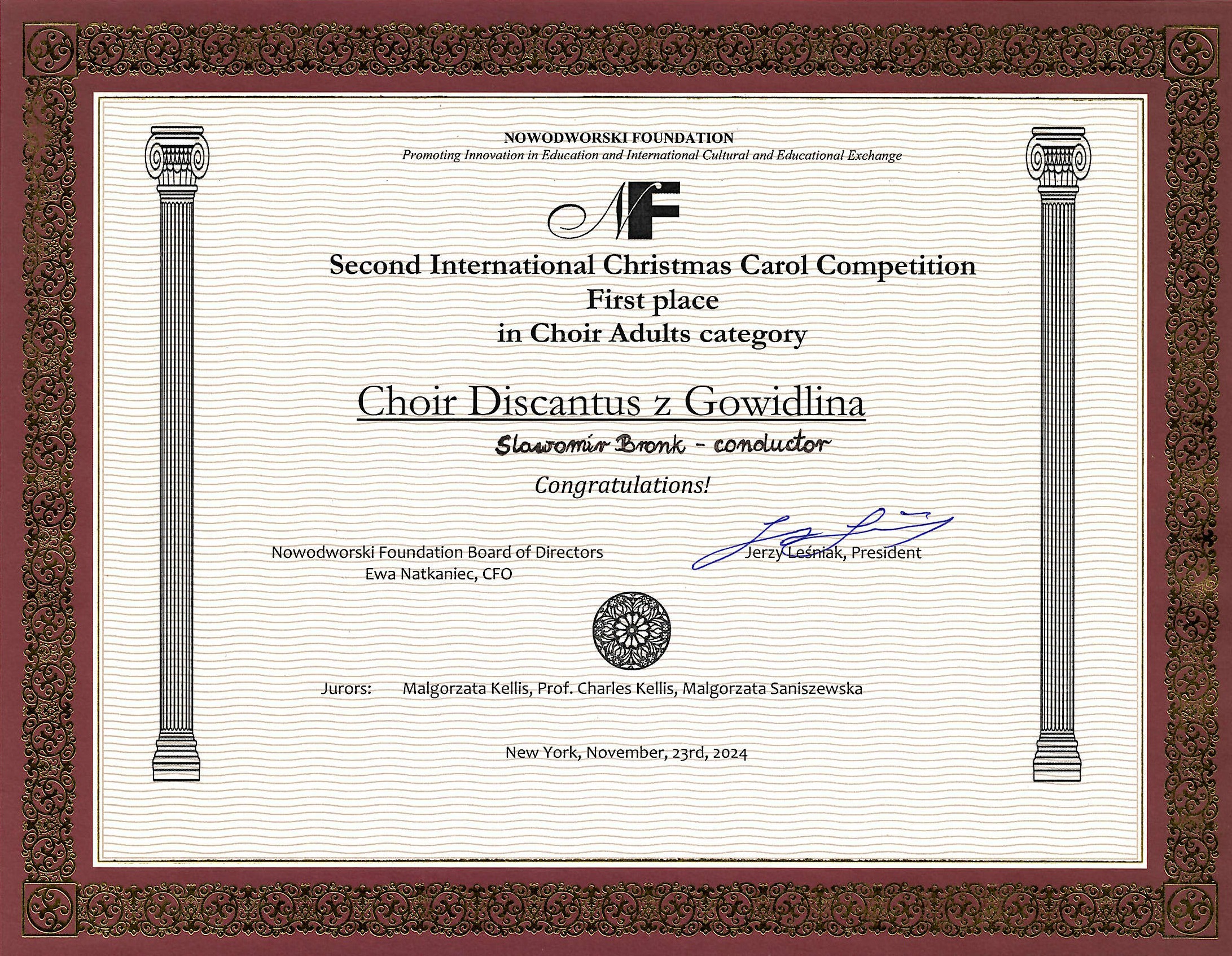 Chór Kameralny Discantus pod dyr. dra hab. Sławomira Bronka zdobył I MIEJSCE w kategorii Chórów dorosłych na Second International Christmas Carol Competition w Nowym Jorku/USA (22–23.11.2024).