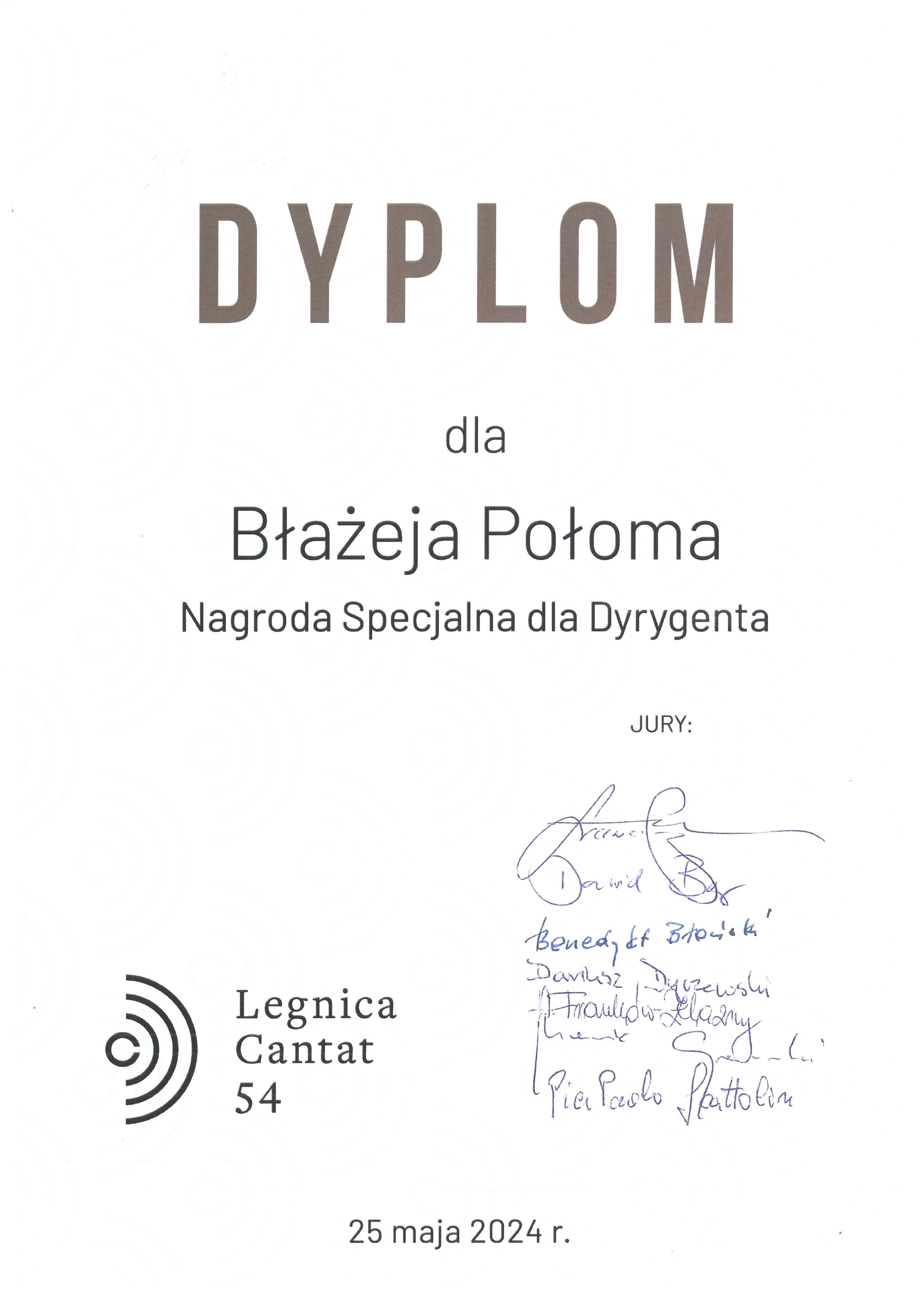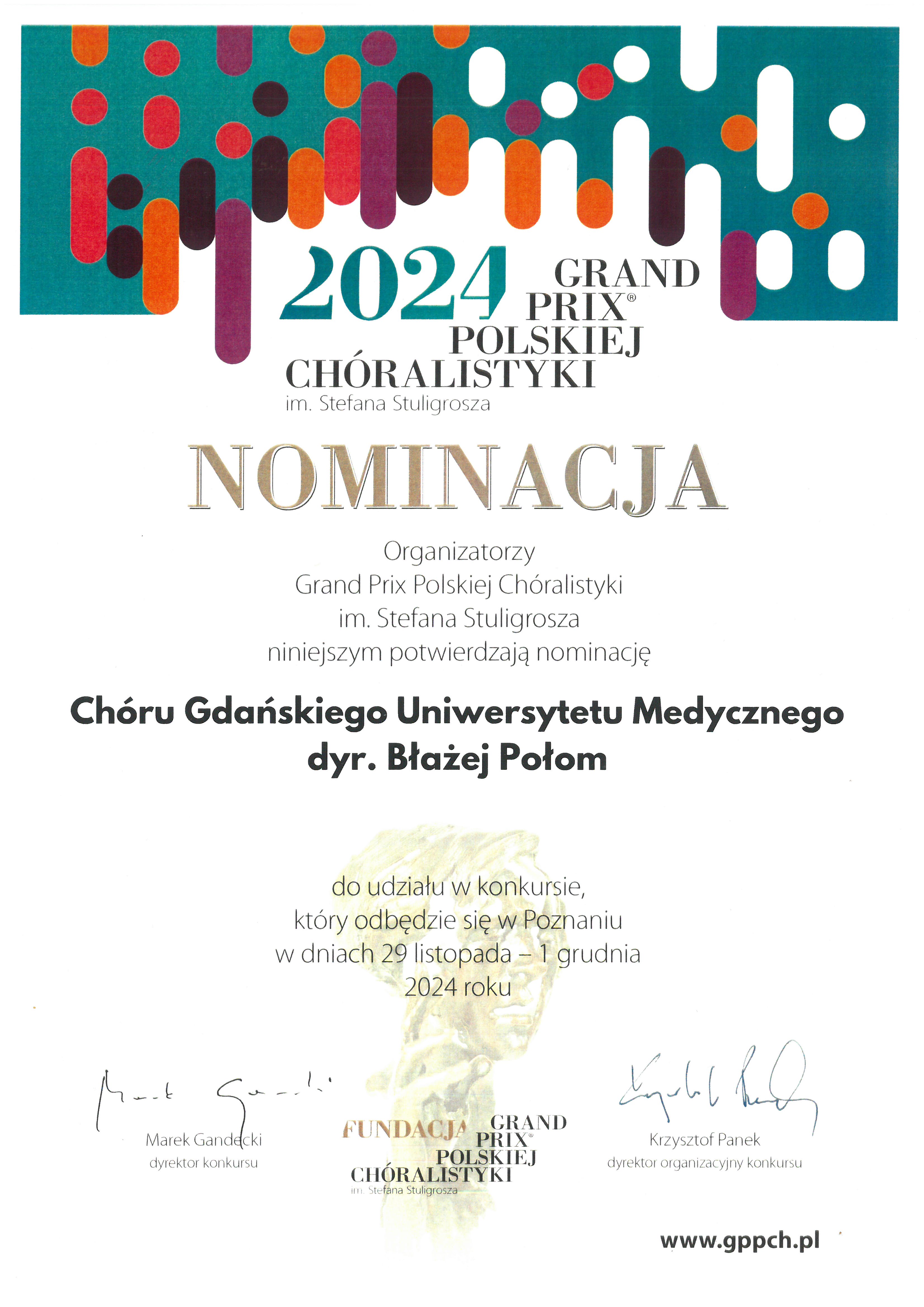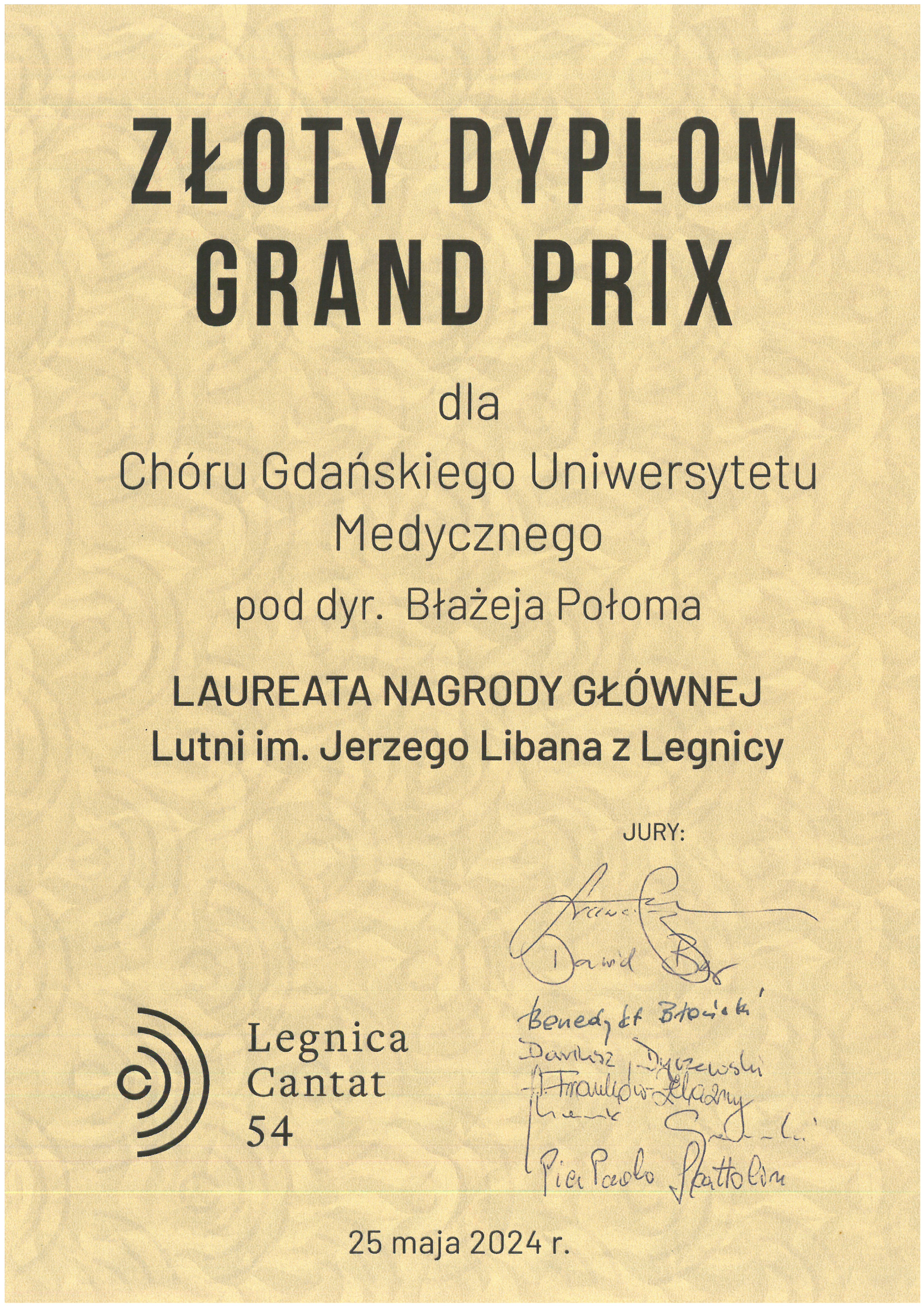 Chór Gdańskiego Uniwersytetu Medycznego im. Tadeusza Tylewskiego pod dyr. dra Błażeja Połoma, pedagoga aMuz, zdobył ZŁOTY DYPLOM GRAND PRIX jako laureat NAGRODY GŁÓWNEJ – Lutni im. Jerzego Libana z Legnicy, ZŁOTY DYPLOM jako laureat I MIEJSCA – nagrody im. Henryka Karlińskiego, NAGRODĘ SPECJALNĄ DLA DYRYGENTA podczas Ogólnopolskiego Turnieju Chórów w ramach 54. Festiwalu Legnica Cantat w Legnicy (24-26.05.2024). Jednocześnie Chór GUMed otrzymał NOMINACJĘ do udziału konkursie Grand Prix Polskiej Chóralistyki, który odbędzie się w dniach 29.11-1.12.2024 w Poznaniu.