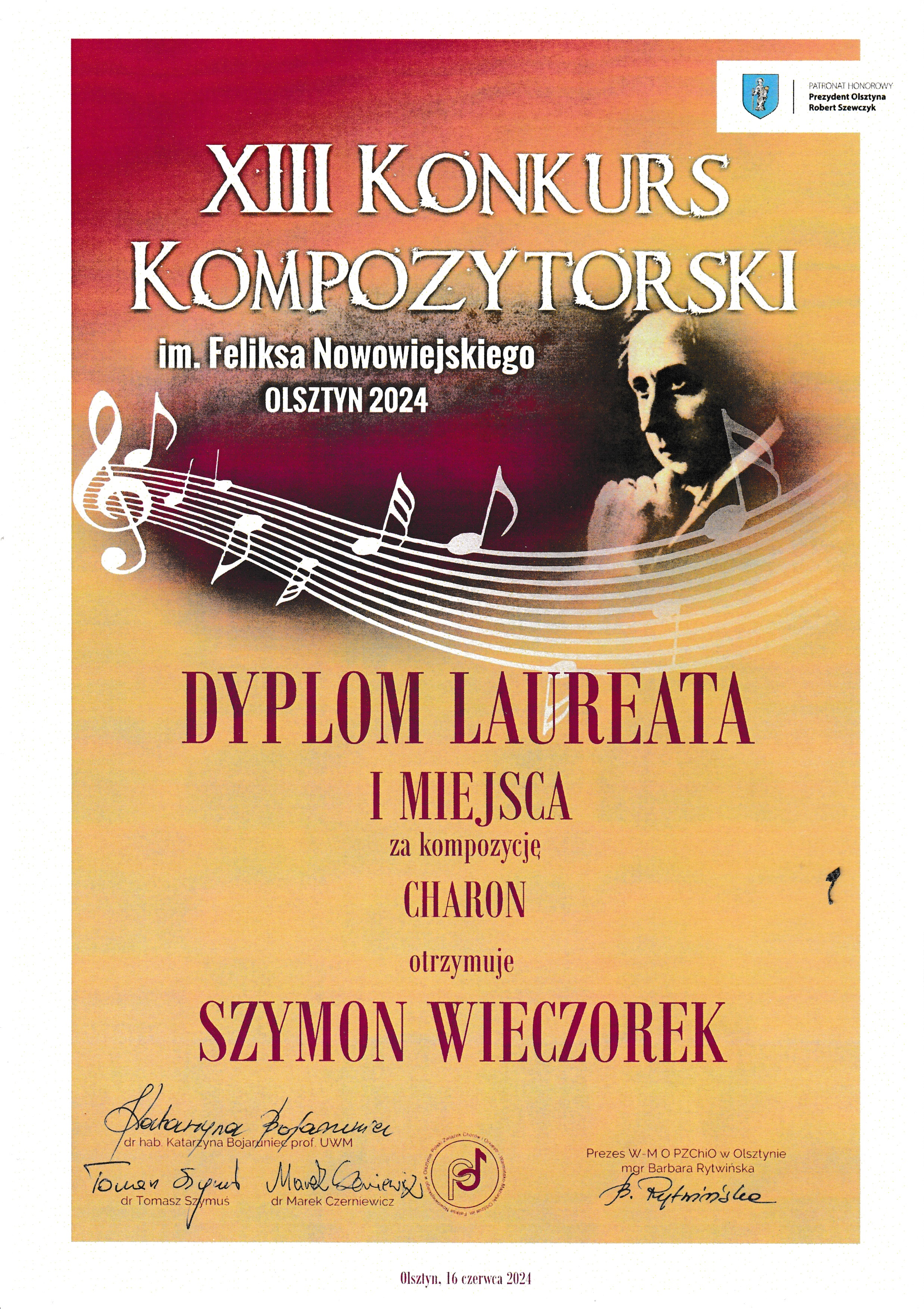 Szymon Wieczorek (I rok studiów II st.) z klasy kompozycji mgra Pawła Mykietyna zajął I MIEJSCE za utwór „Charon” na XIII Konkursie Kompozytorskim im. Feliksa Nowowiejskiego w Olsztynie (16.06.2024). Utwór powstał w ramach zajęć prowadzonych przez mgr Annę Rocławską-Musiałczyk.