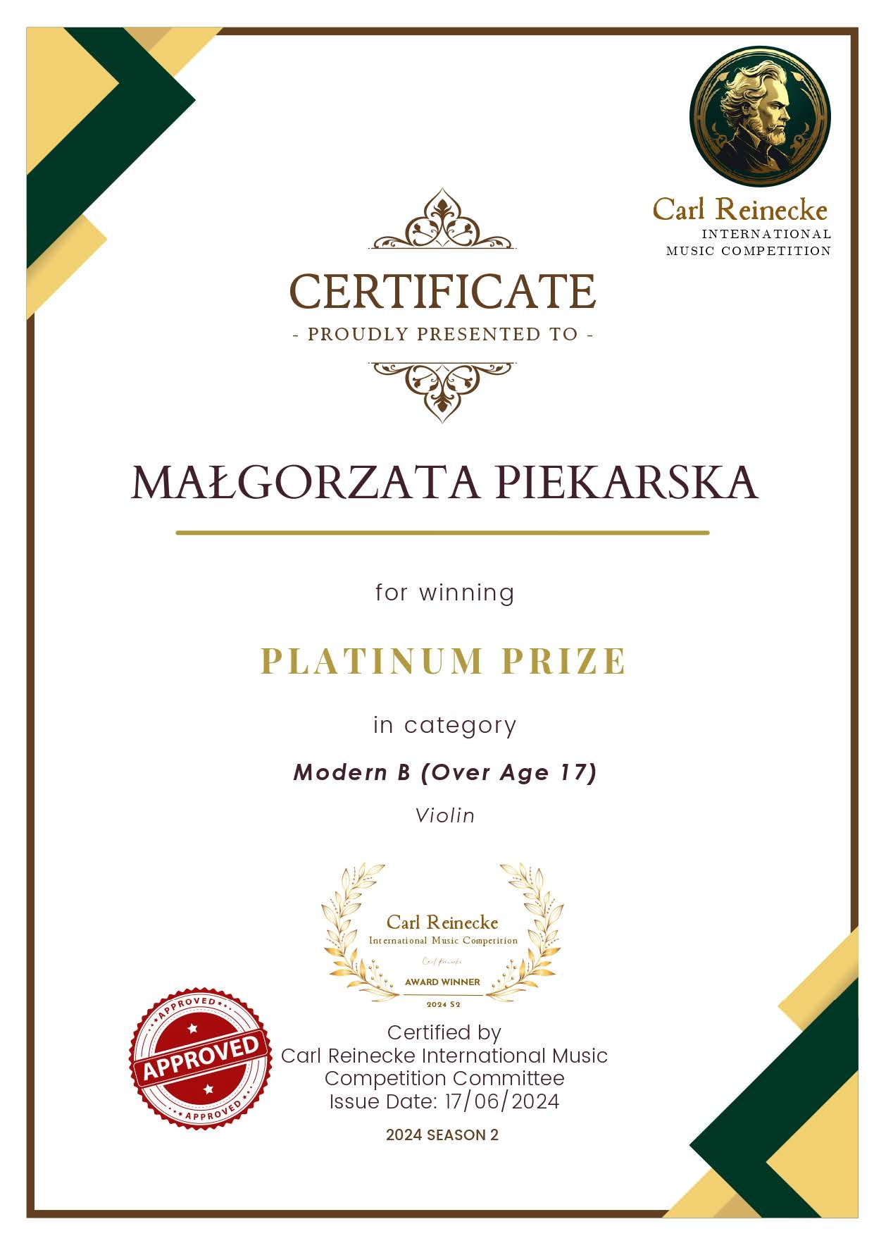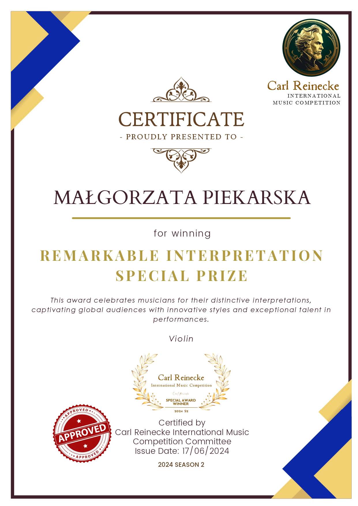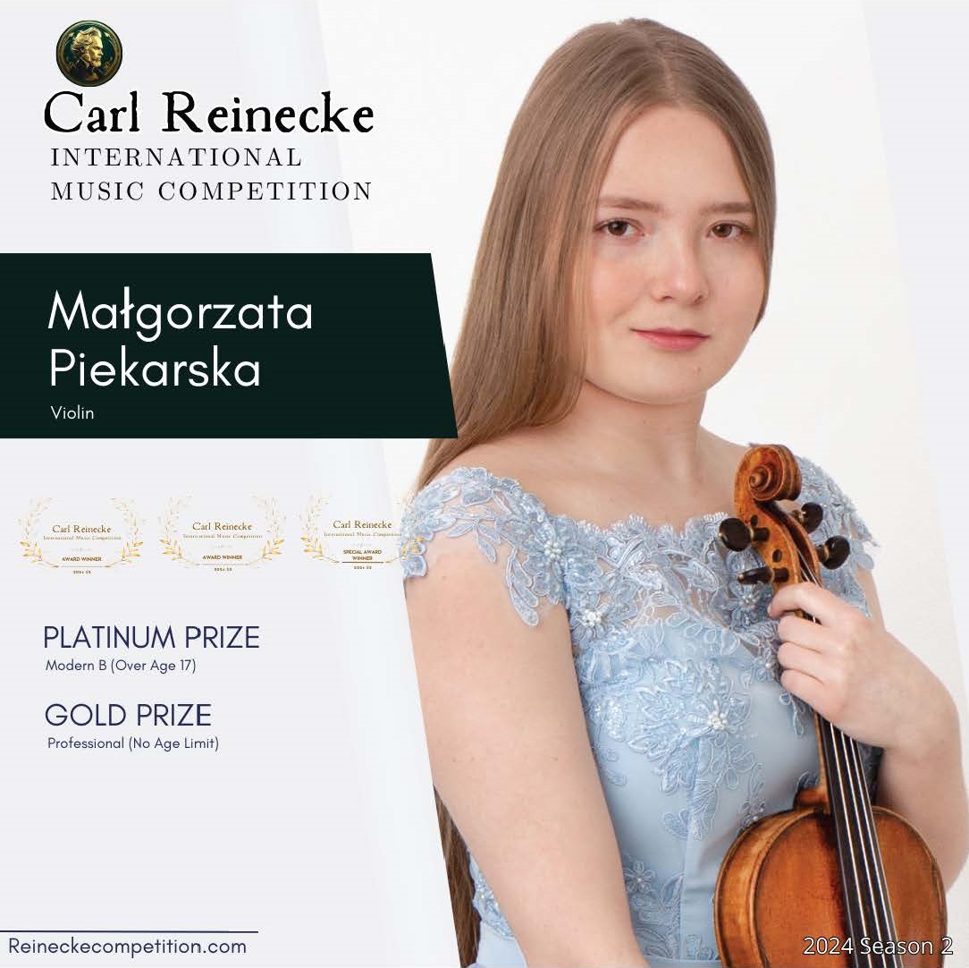Małgorzata Piekarska (I rok studiów II st.) z klasy skrzypiec prof. dr hab. Małgorzaty Skorupy zdobyła PLATINUM PRIZE w kat. Modern B (Over Age 17), GOLD PRIZE w kat. Professional oraz REMARKABLE INTERPRETATION SPECIAL PRIZE na Carl Reinecke International Music Competition / Międzynarodowym Konkursie Muzycznym im. Carla Reinecke online (17.06.2024). Przy fortepianie towarzyszył studentce mgr Andrzej Siarkiewicz.