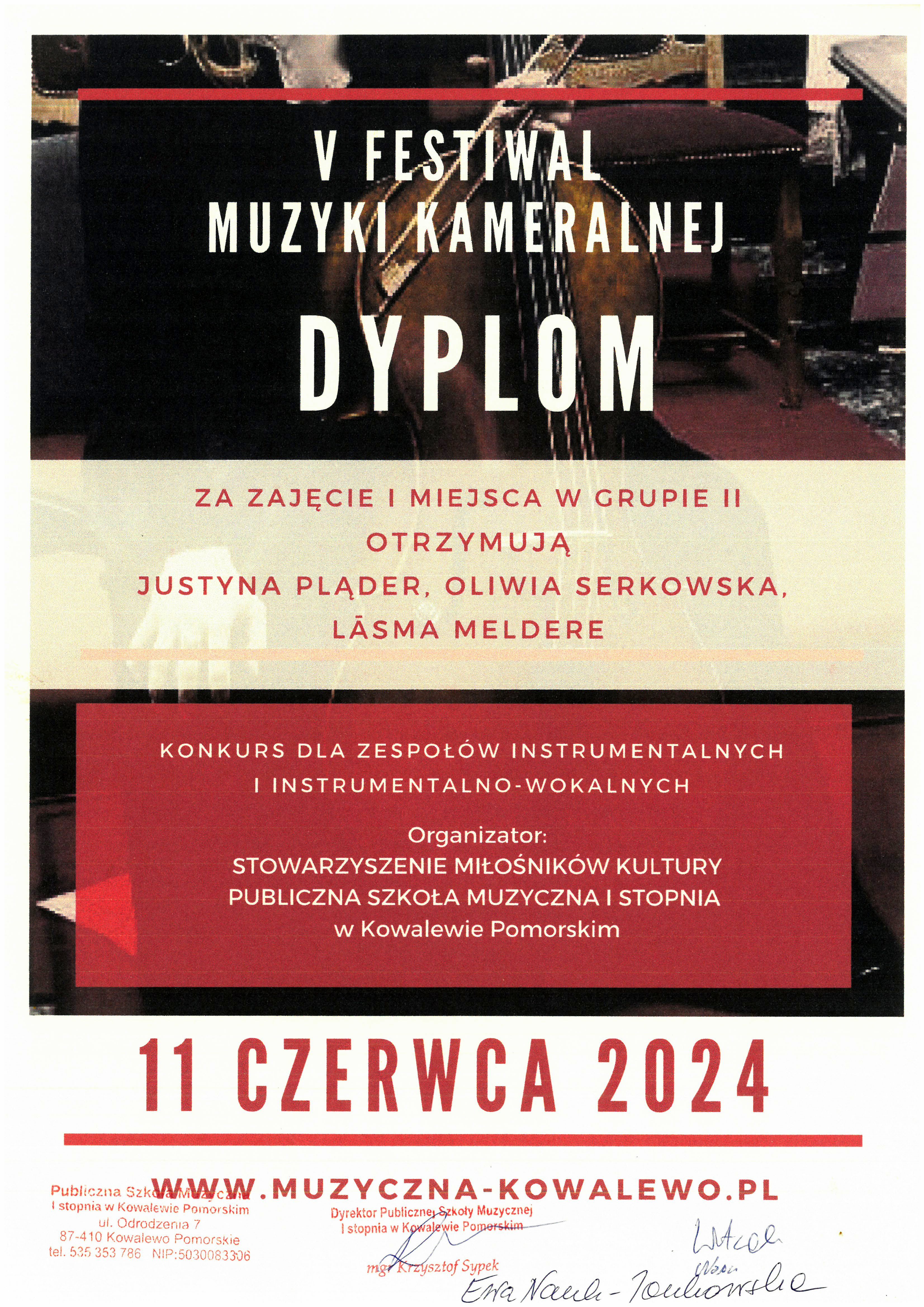 Zespół all'TRE Trio w składzie: Justyna Pląder (III rok studiów I st.) – skrzypce, Oliwia Serkowska (I rok studiów II st.) – wiolonczela, Lāsma Monika Meldere (I rok studiów II st.) – fortepian, z klasy kameralistyki dr Ewy Sarwińskiej-Kowalczyk, dr Pauli Preuss i prof. Sebastiana Hamanna zajął I MIEJSCE w gr. II na Konkursie dla Zespołów Instrumentalnych i Instrumentalno-Wokalnych w ramach V Festiwalu Muzyki Kameralnej w Kowalewie Pomorskim (11.06.2024).
