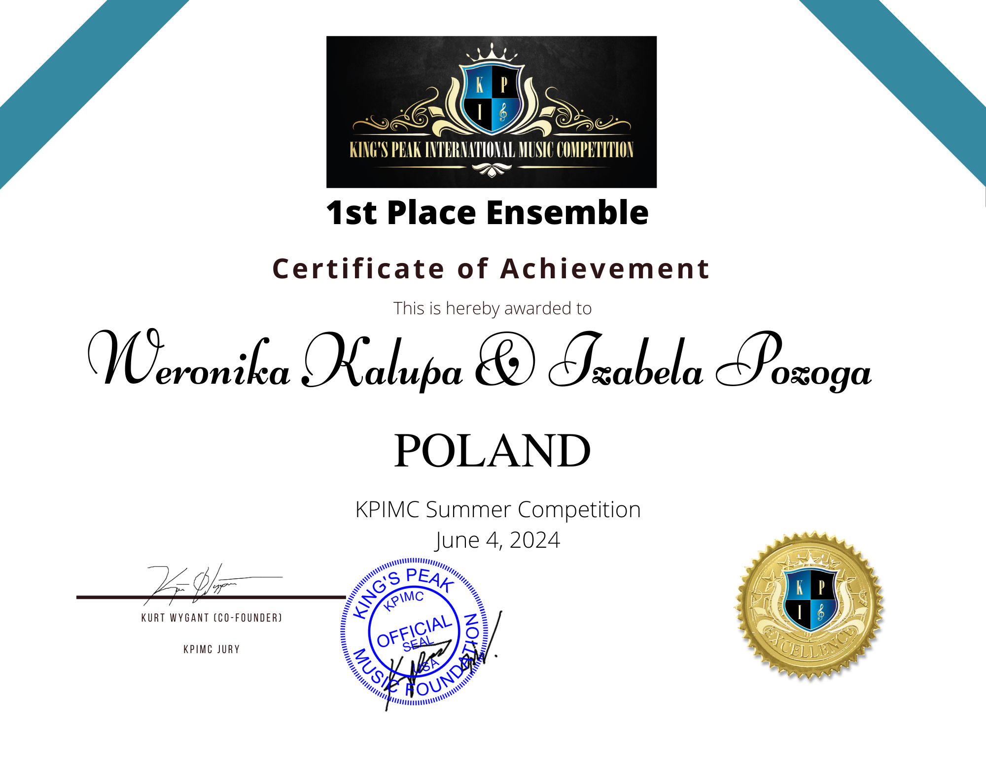 Air Duo w składzie: Weronika Kalupa (II rok studiów I st.) – saksofon i Izabela Pożoga (III rok studiów I st.) – fortepian z klasy nauki akompaniamentu dr hab. Izabeli Paszkiewicz-Ginter i dra Szymona Zawodnego zdobyło I MIEJSCE na King's Peak International Music Competition 2024 (4.06.2024).