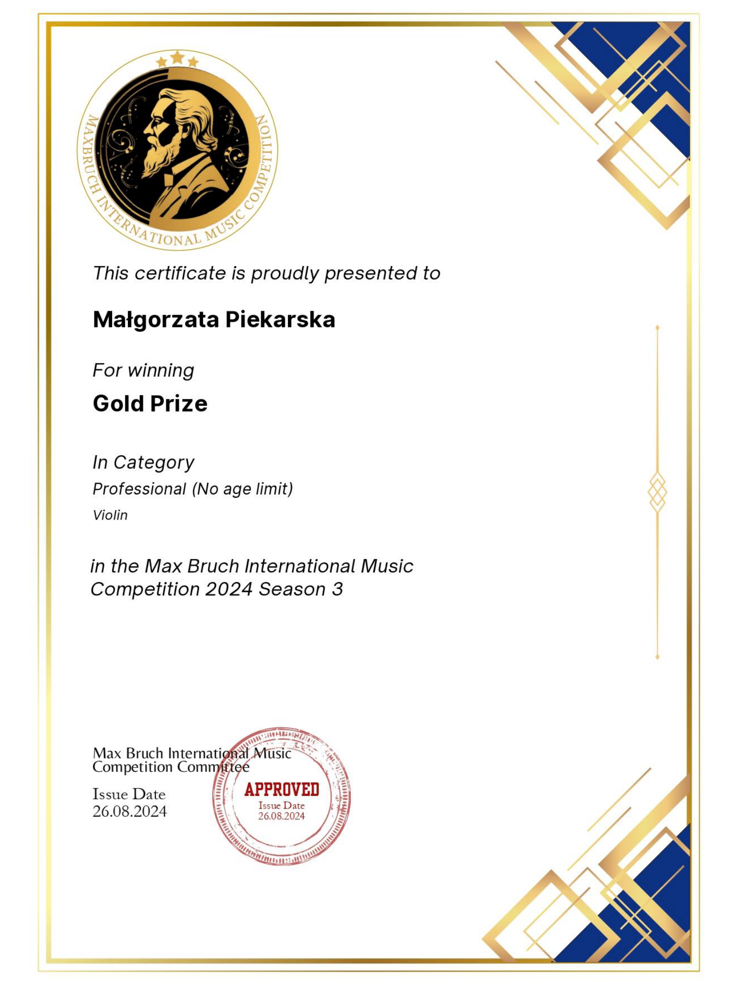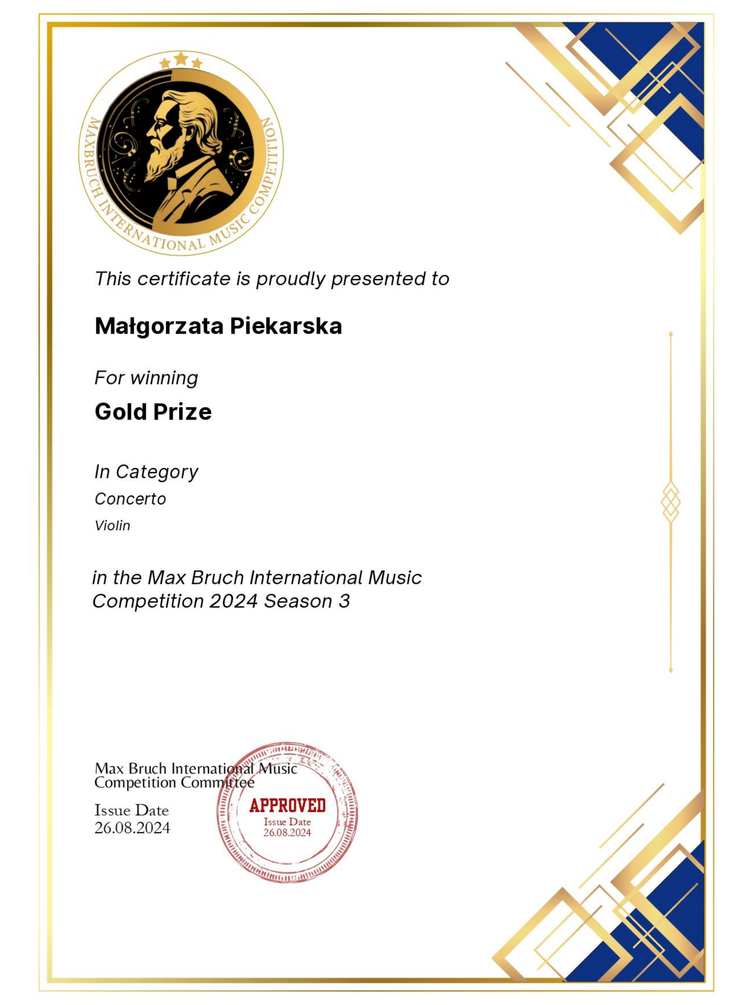 Małgorzata Piekarska (I rok studiów II st.) z klasy skrzypiec prof. dr hab. Małgorzaty Skorupy zdobyła GOLD PRIZE w kat. Professional i GOLD PRIZE w kat. Concerto w sekcji skrzypce na Max Bruch International Music Competition, season 3 (26.08.2024). Przy fortepianie towarzyszył studentce mgr Andrzej Siarkiewicz.