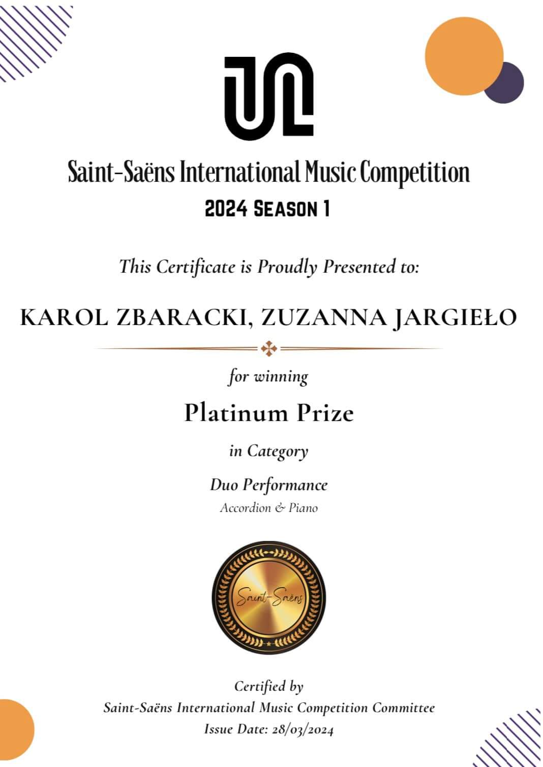 Zuzanna Jargieło (I rok studiów II st.) i Karol Zbaracki (I rok studiów II st.) z klasy nauki akompaniamentu dr Izabeli Paszkiewicz-Ginter zdobyli PLATYNOWĄ NAGRODĘ na Saint-Saëns International Music Competition 2024 (28.03.2024). Konkurs odbył się w formule online.