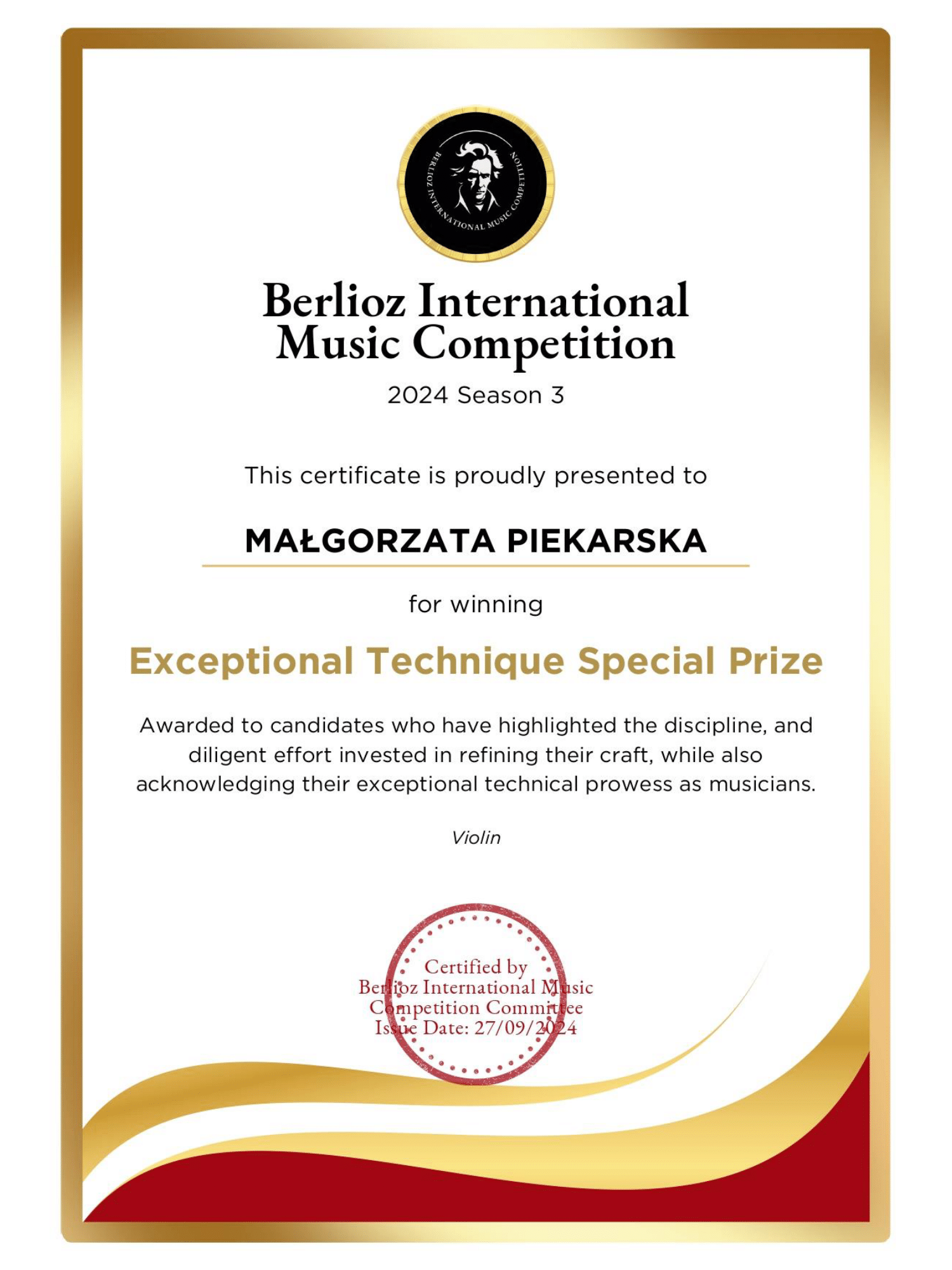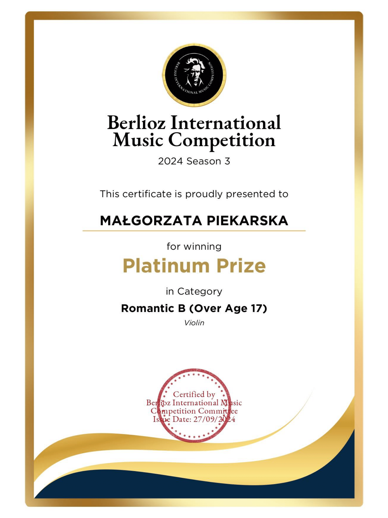 Małgorzata Piekarska (I rok studiów II st.) z klasy skrzypiec prof. dr hab. Małgorzaty Skorupy zdobyła PLATINUM PRIZE w kat. Romantic, GOLD PRIZE w kat. Professional i NAGRODĘ SPECJALNĄ Exceptional Technique Special Prize na Berlioz International Music Competition (wrzesień 2024). Przy fortepianie towarzyszył studentce mgr Andrzej Siarkiewicz.